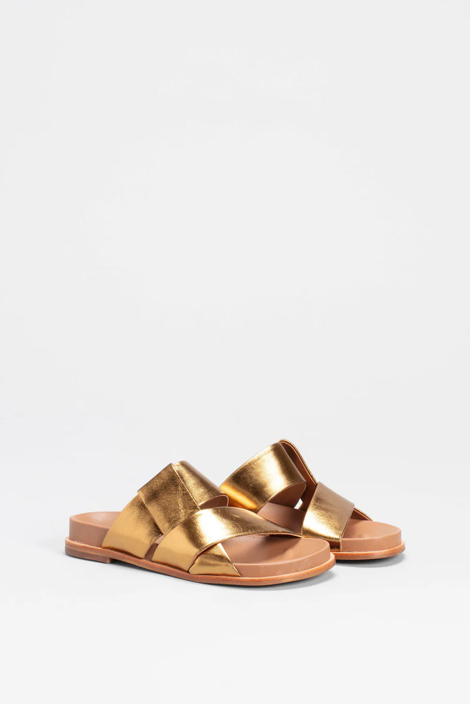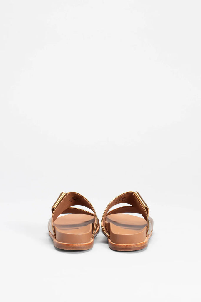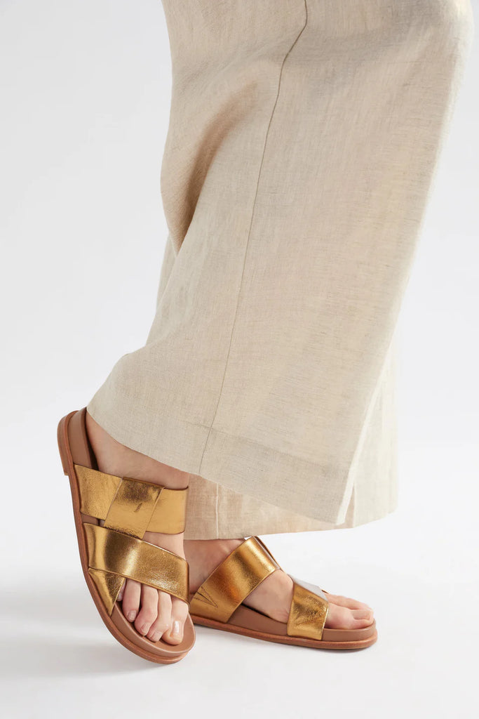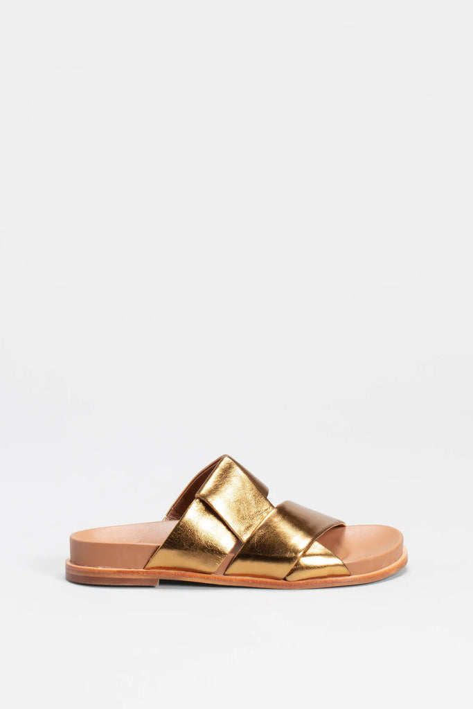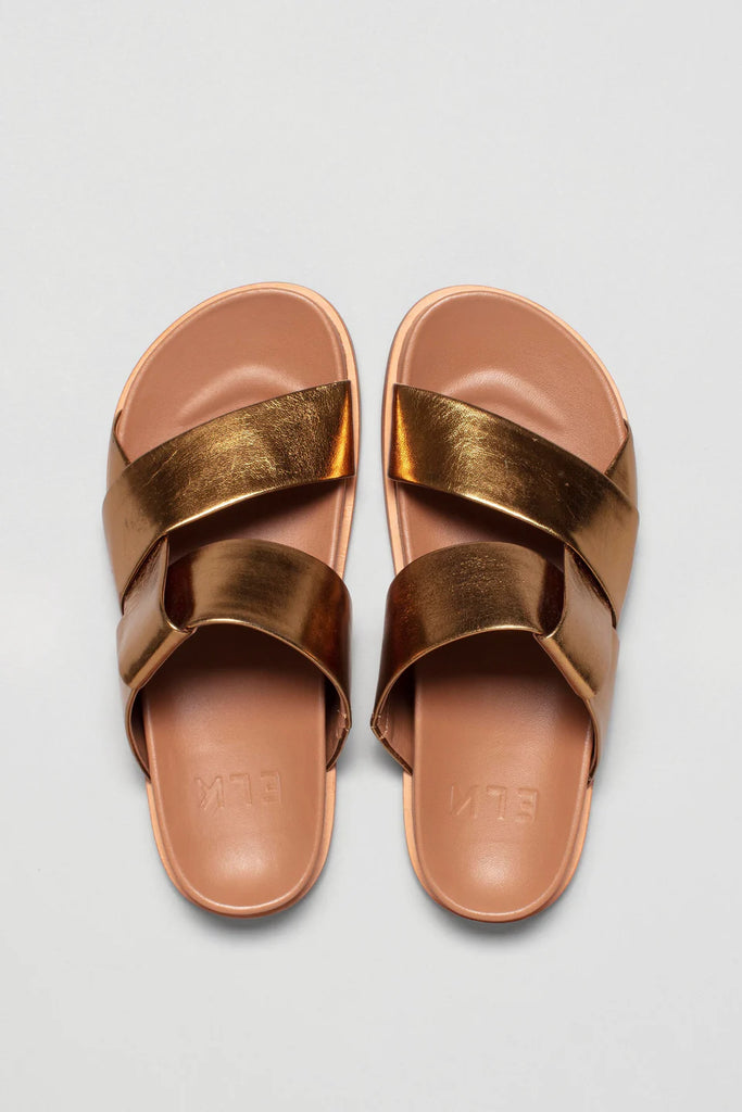 ELKThe Uma Slide is a style that will brighten any outfit, coming in two metallic colourways and a matte black leather. The slide features a crossover strap design and a moulded footbed.