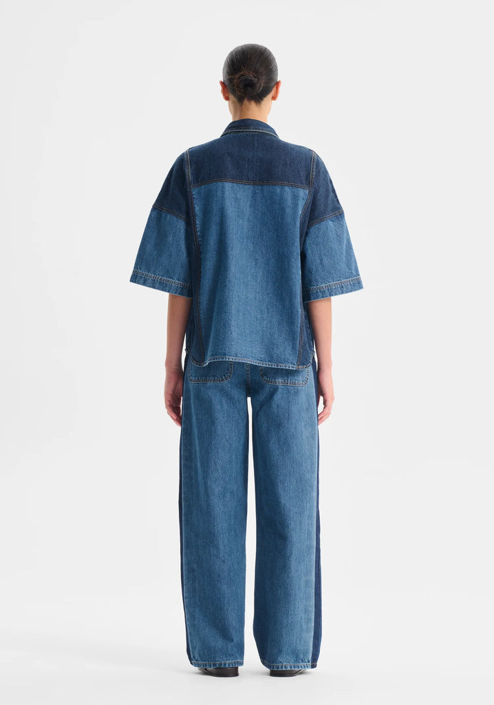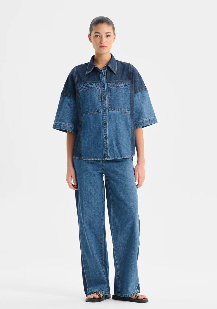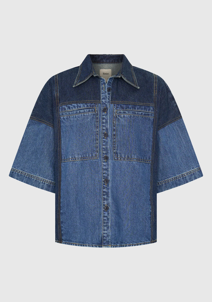 MorrisonThe Dexter Denim Shirt is made from mid-weight, two-tone cotton for structure and style. Featuring a traditional collar, dropped shoulders, and short sleeves, it’s designed with a relaxed boxy fit for effortless layering. Contrast yoke and side panels at the front and back add dimension, while chest jet patch pockets and a curved hem complete the look with subtle detail.