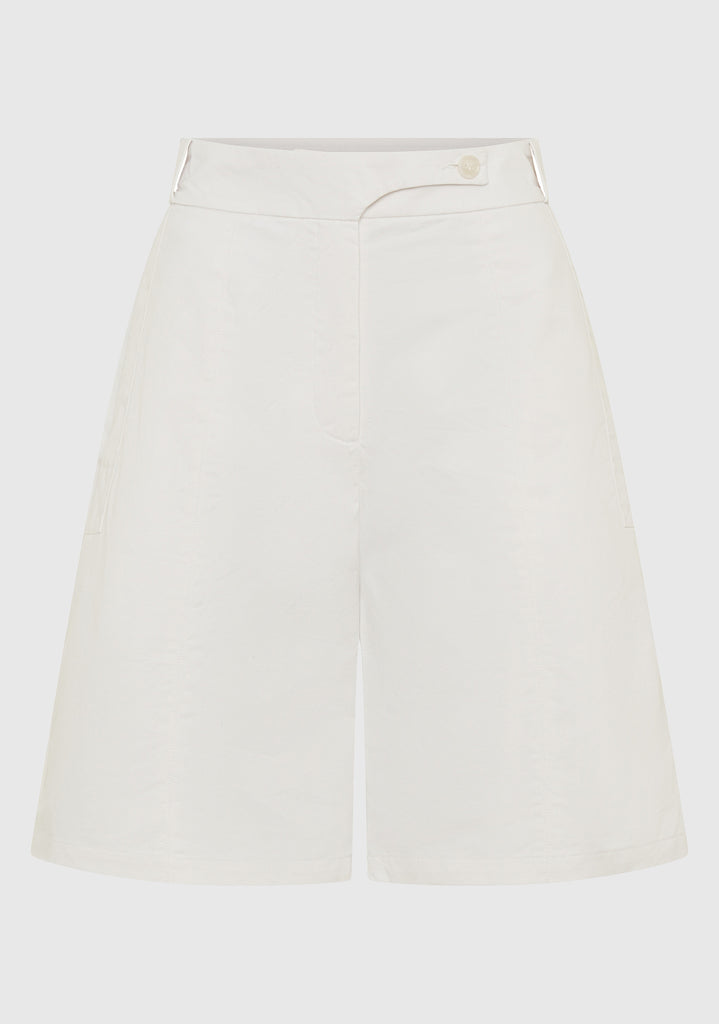 MorrisonTailored in premium cotton twill, the Hugo Bermuda Short offers a clean, modern silhouette with a mid-rise waist and fly front with tab closure. Subtle cross-stitch detailing at the side pockets and sculpted leg seams front and back add refined structure. Finished with a back flap pocket and an above-the-knee cut, this piece blends effortless polish with everyday ease.