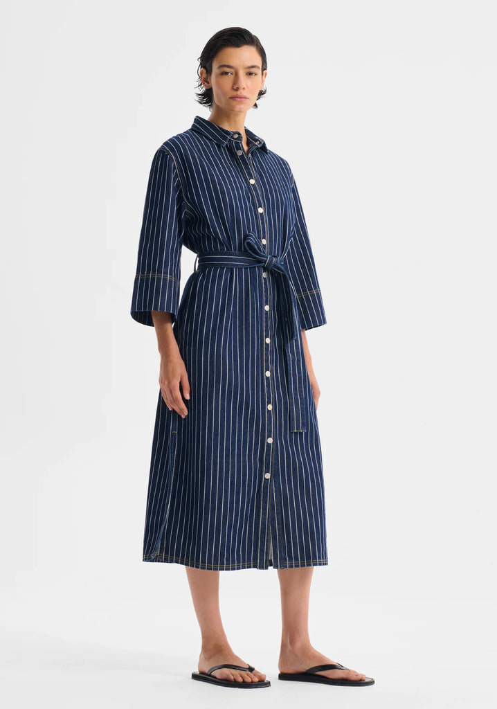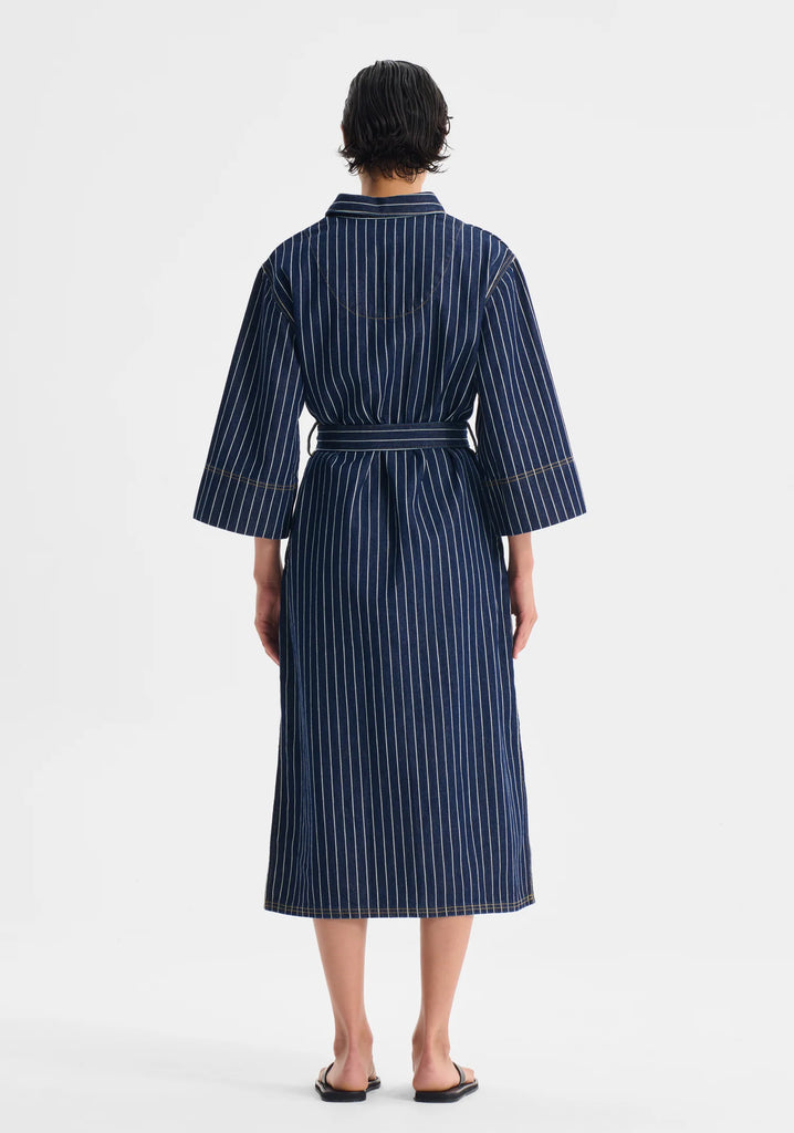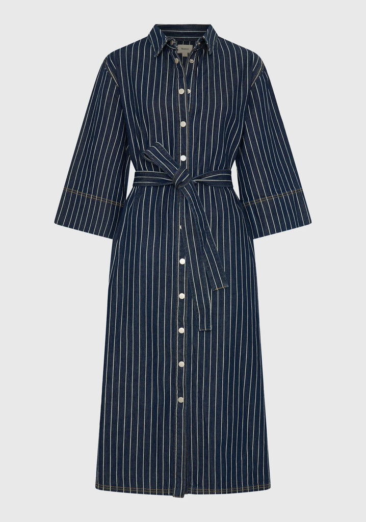 MorrisonCrafted from striped cotton denim, the Wyatt Dress features a traditional collar, metal snap front fastening, and dropped shoulders for a relaxed look. Designed with 3/4 length wide sleeves, side seam pockets, and side splits at the midi-length hem. Comes with a self-fabric belt to define the waist.