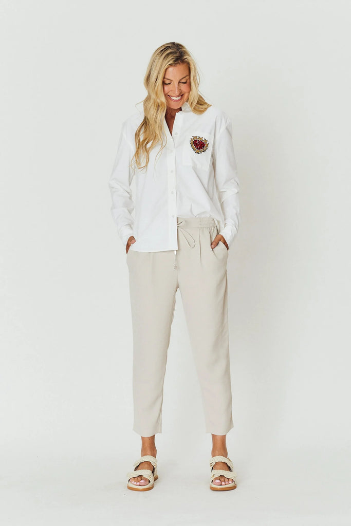 We Are The OthersMeet the Chloe Shirt in crisp white with a striking beaded heart emblem on the chest pocket — a fresh spin on a classic silhouette. Crafted from a soft cotton/TENCEL™ blend, this shirt is lightweight, breathable, and beautifully draped for all-day comfort.