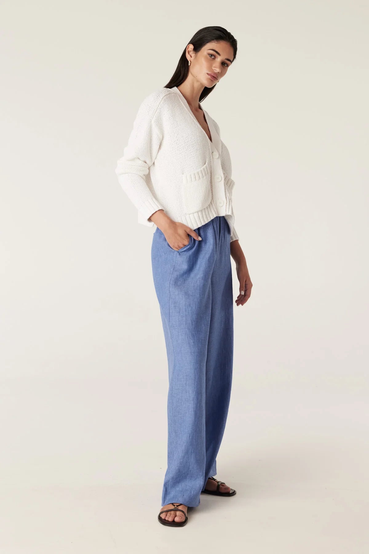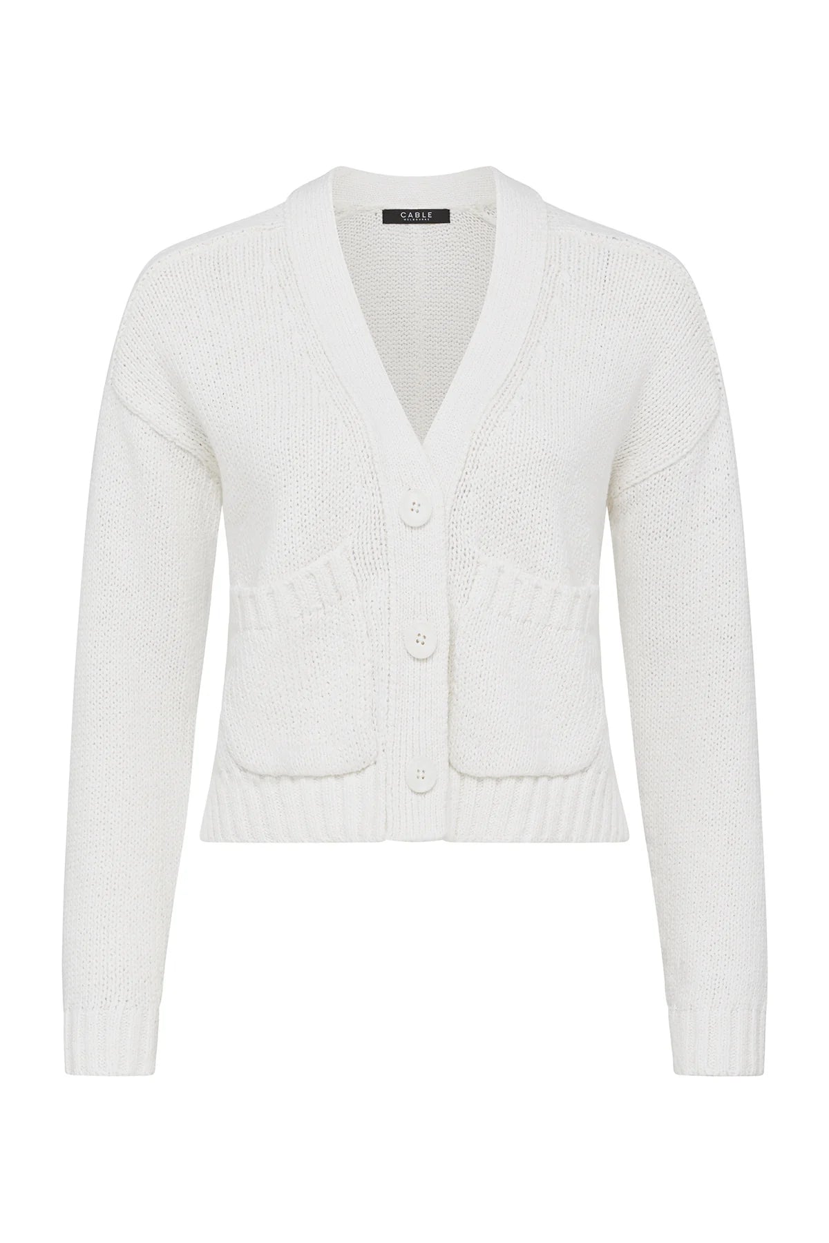 The Coast Knit Cardigan is a relaxed fit style in a heavy weight cotton linen blend. It features a V neckline with front button closure, saddle shoulders and front patch pockets. Defined by its textured knit, it is finished with rib trims and a split hem for ease of wear.