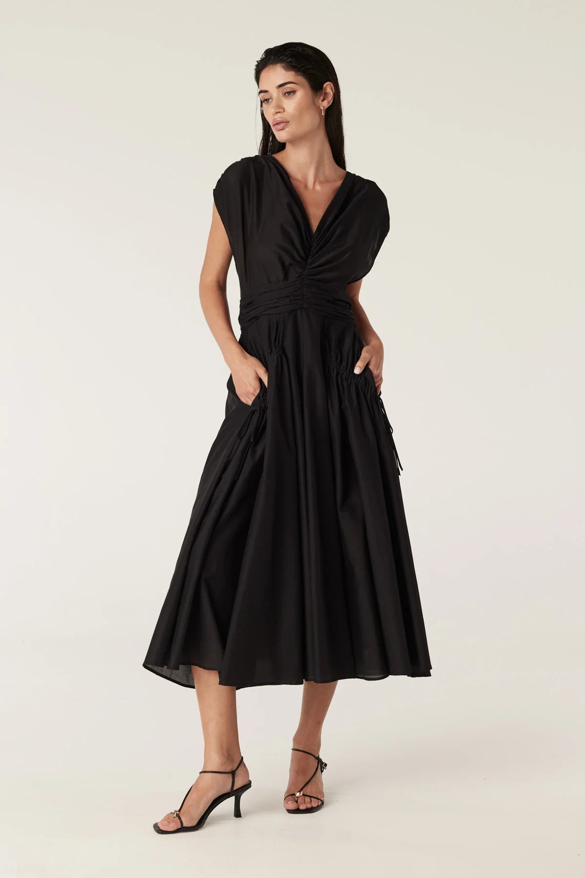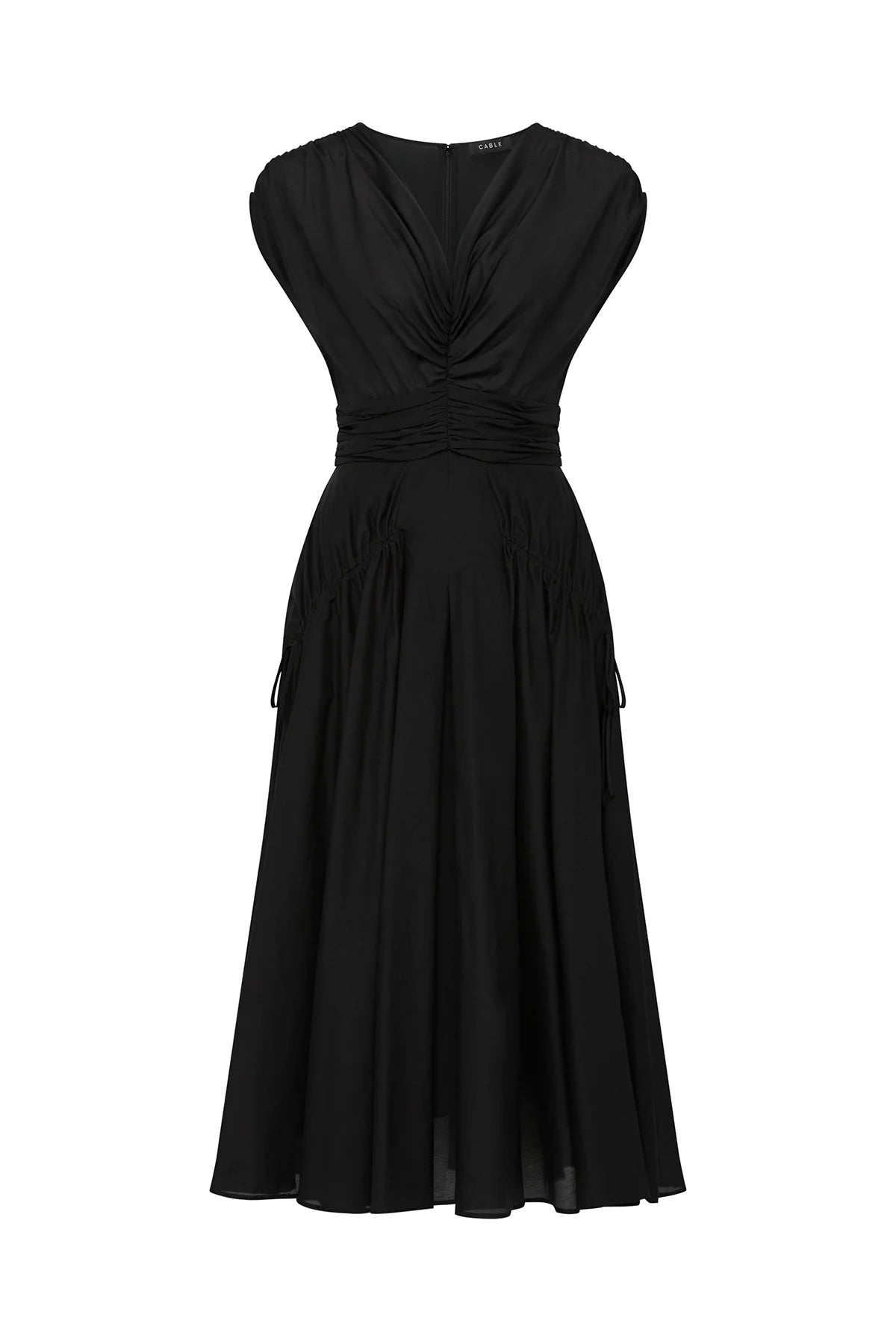 The Layla Midi Dress features a fit-and-flare silhouette with soft gathers at the front V-neck and waist. It has rouching details with ties on the low hip and an invisible back zip. Made from sheer silk / cotton voile with a cotton lining.