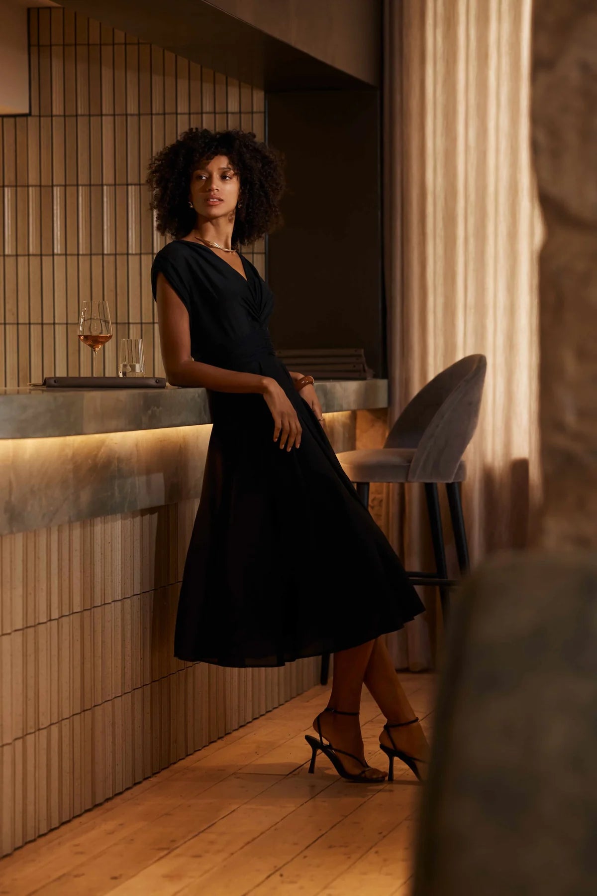 - Rouching details with ties on low hip