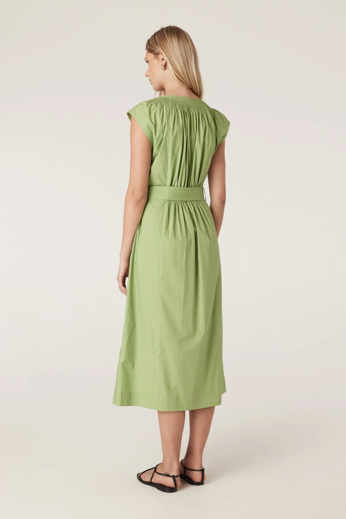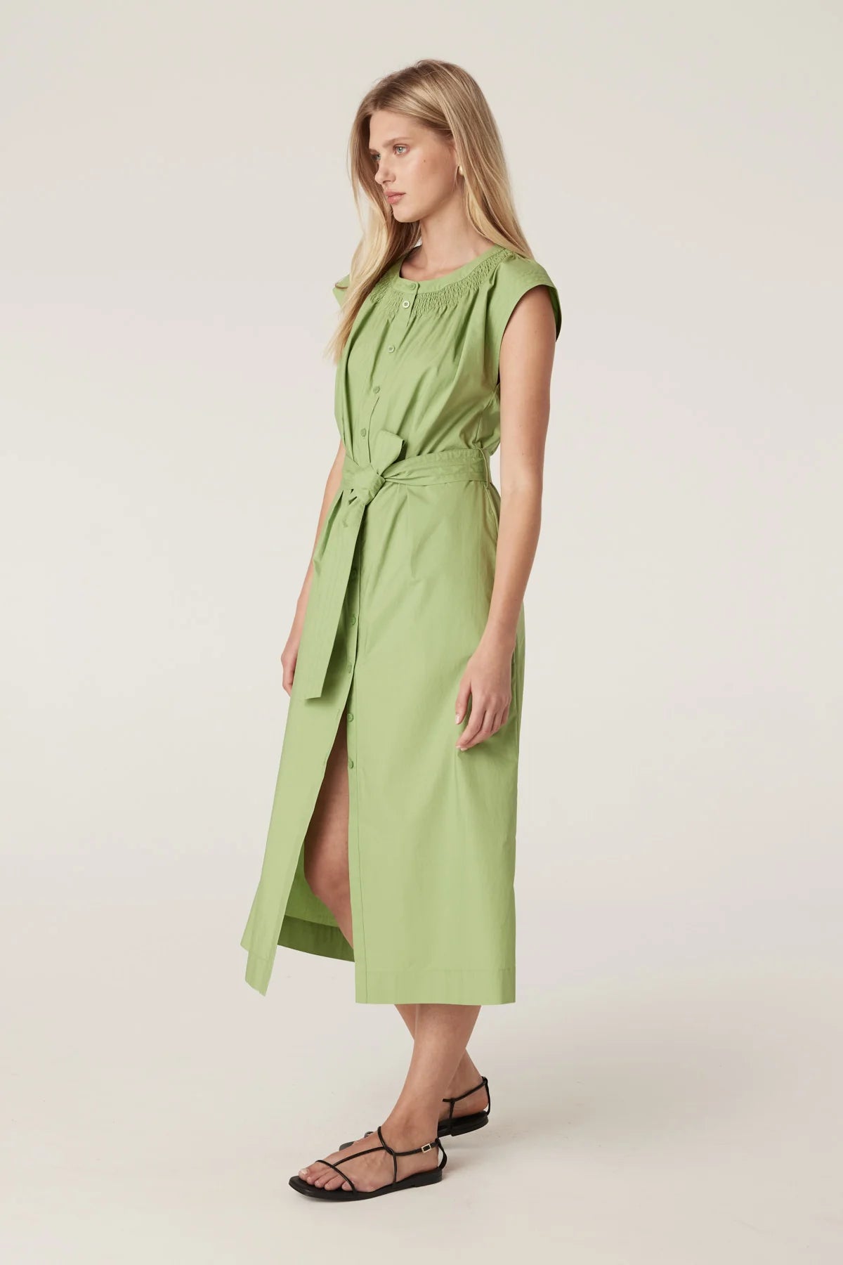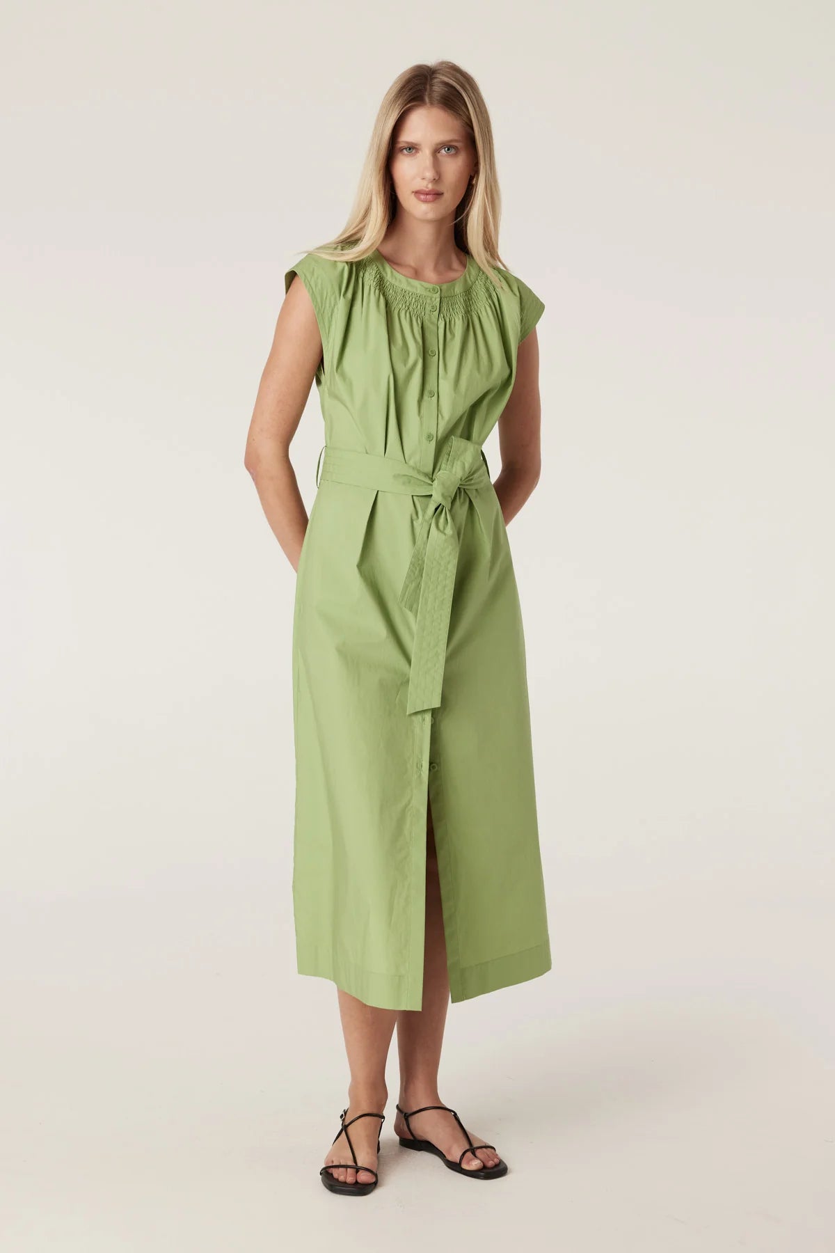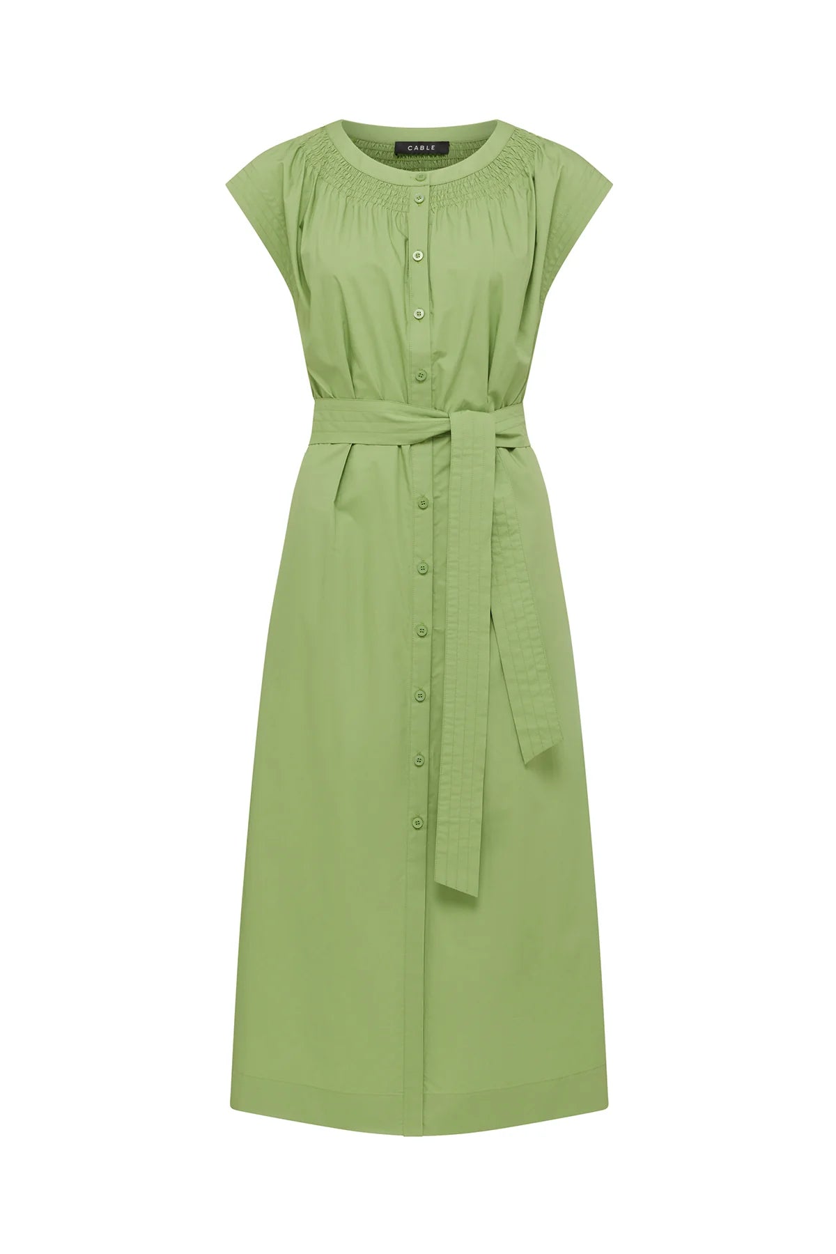 The Verdi Dress is crafted from 100% cotton poplin. Designed in a regular fit, it features a button-through front and a round neckline with shirring detail, complemented by an elastic shirring panel at the back waist. A matching belt with stitching detail and side pockets complete the style.