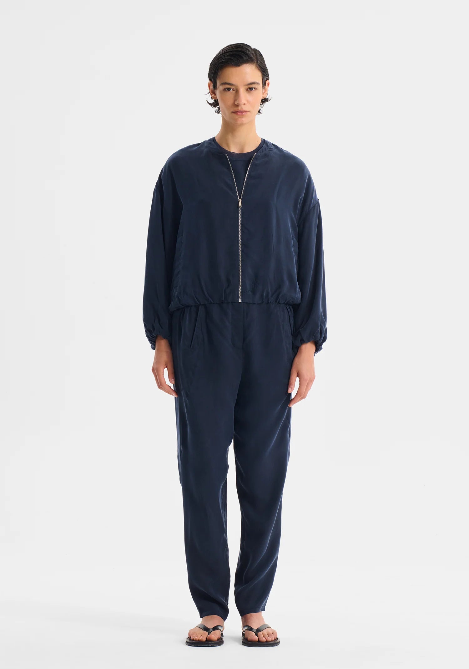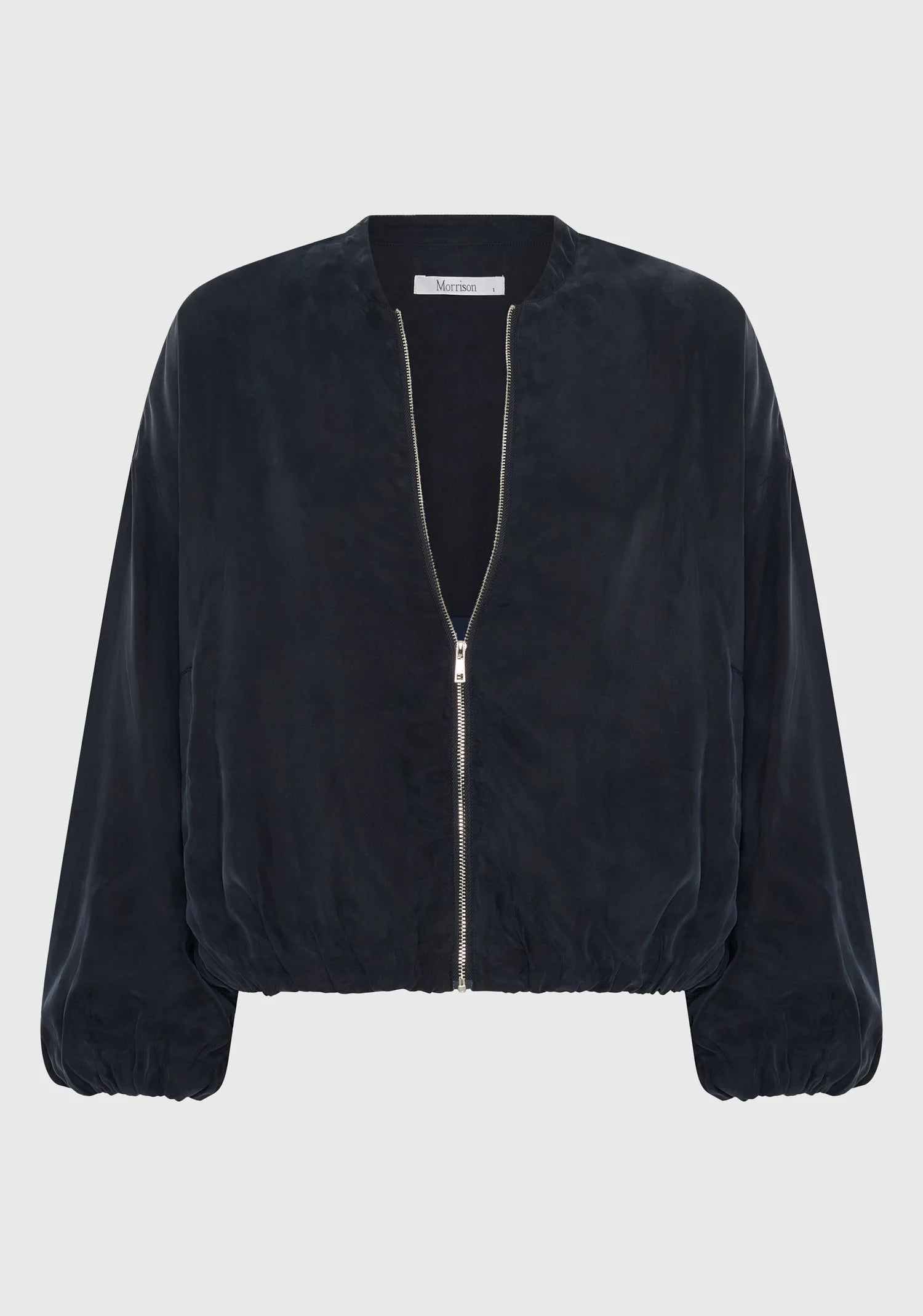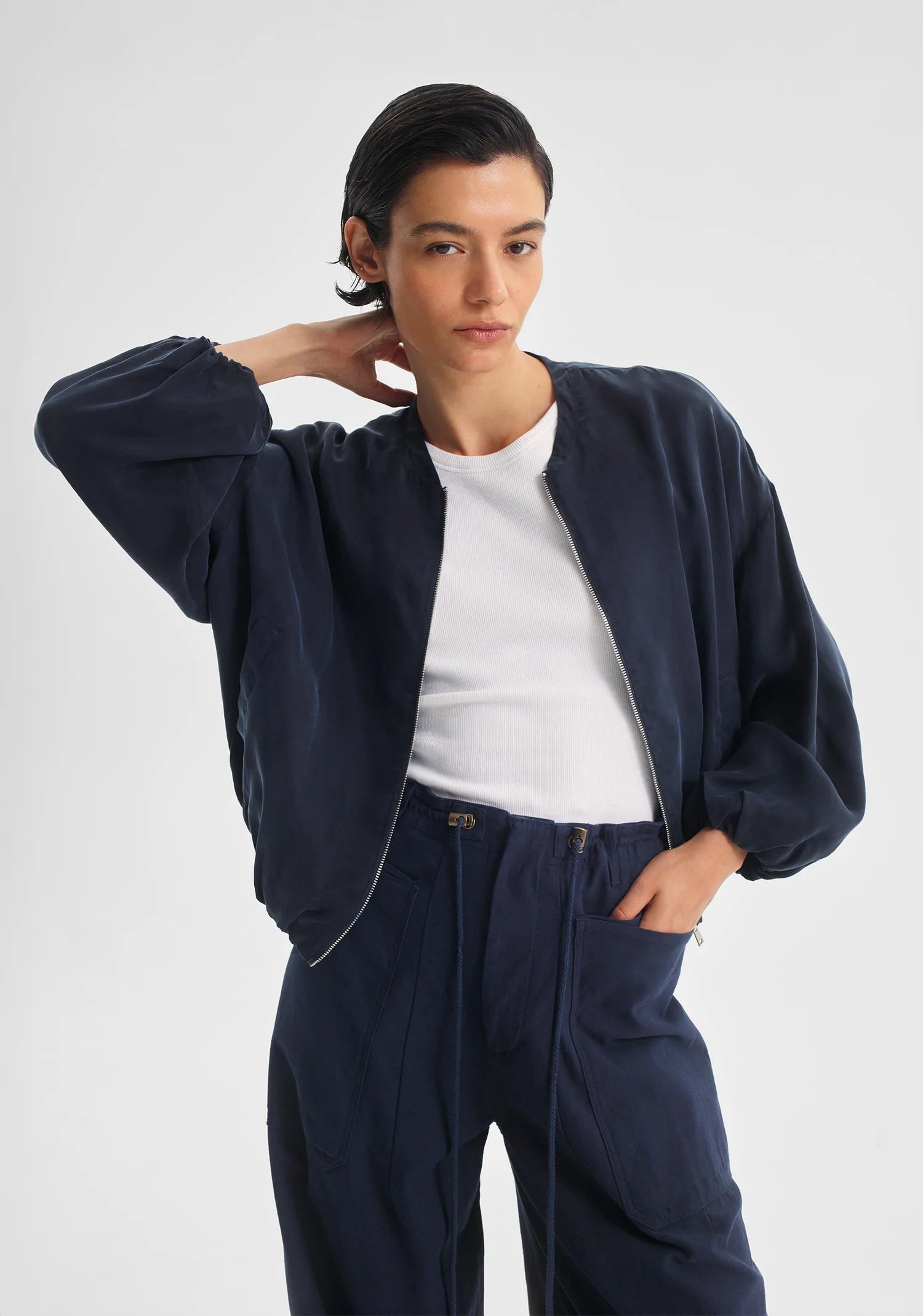 Crafted from a smooth cupro blend, the Zeke Jacket features a round neckline, dropped shoulders, and a relaxed fit. A zip-front closure, front welt pockets, and concealed elastic at the cuffs and hem create a clean, contemporary finish. Fully lined for comfort and ease.