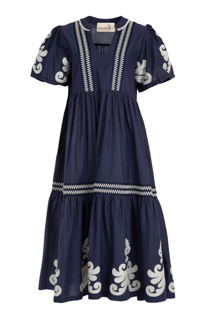 Curate by Trelise CooperStrong embroidery and a lightweight cotton harmoniously combine in the ‘After You My Tier’ dress. Designed intelligently with everyday in mind, this dress is crafted in the ‘Navy in Love’ cotton with a bold, contrasting embroidery. A full, tiered skirt, gathered sleeves and a notched neckline make this pull-on dress a desk-to-dinner savior.