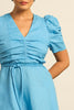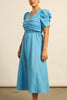The glimmer dress is a statement in summer dressing. A fusing of feminine shape with an elegant and modern air. Crafted in linen, the glimmer dress features a flattering v neckline with front gathers leading into a softly gathered blouson sleeve. An A line skirt creates soft movement and balances perfectly with the more fitted and defined bodice.