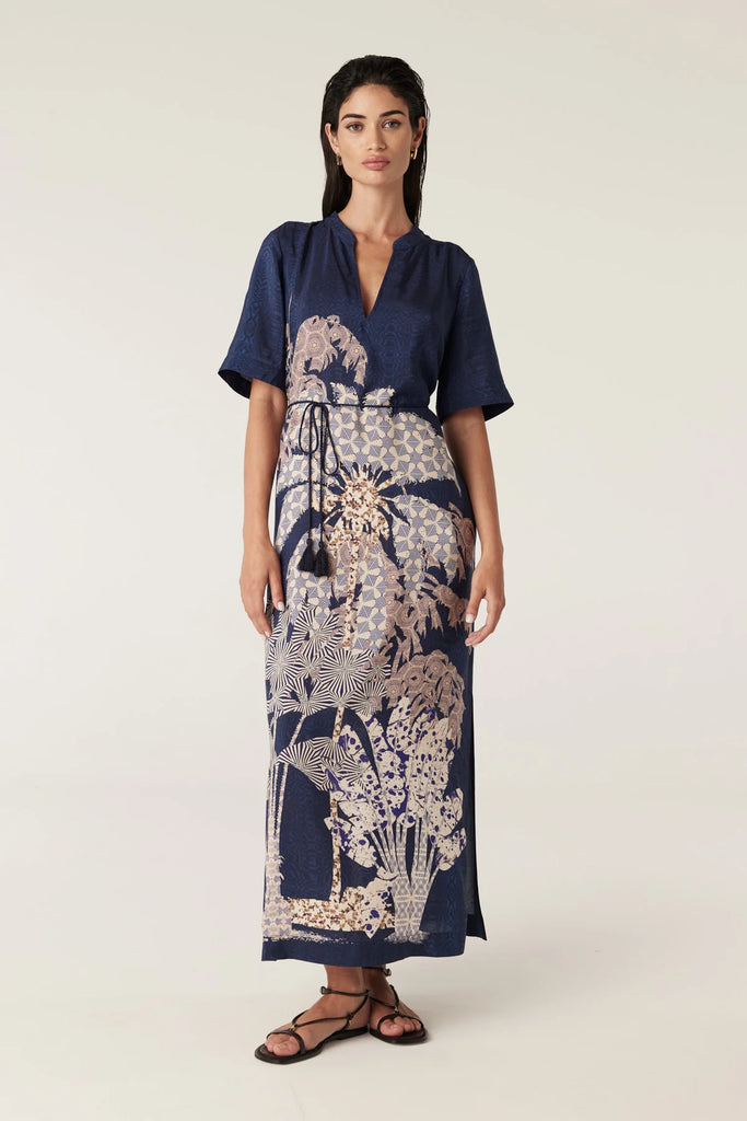 The Pina Kaftan Dress features a relaxed fit with a stand collar and side splits. Made from a lightweight and breathable silk blend with an exclusive print. This kaftan includes a removable waist tie with tassel detail for versatile styling.