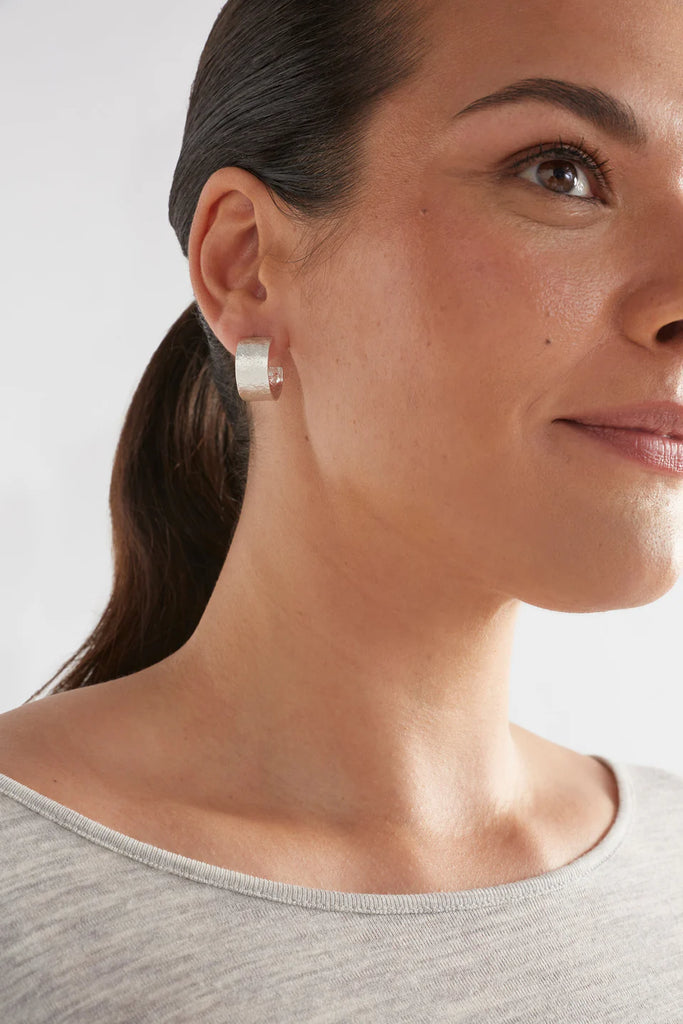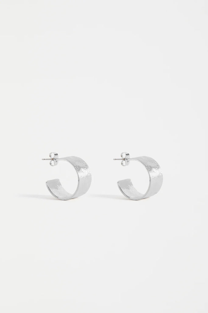 The Gild Hoop Earring is a classic style featuring a hammered texture and a brushed metal finish. This style can be paired with the Gild Cuff Bangle for a versatile look.