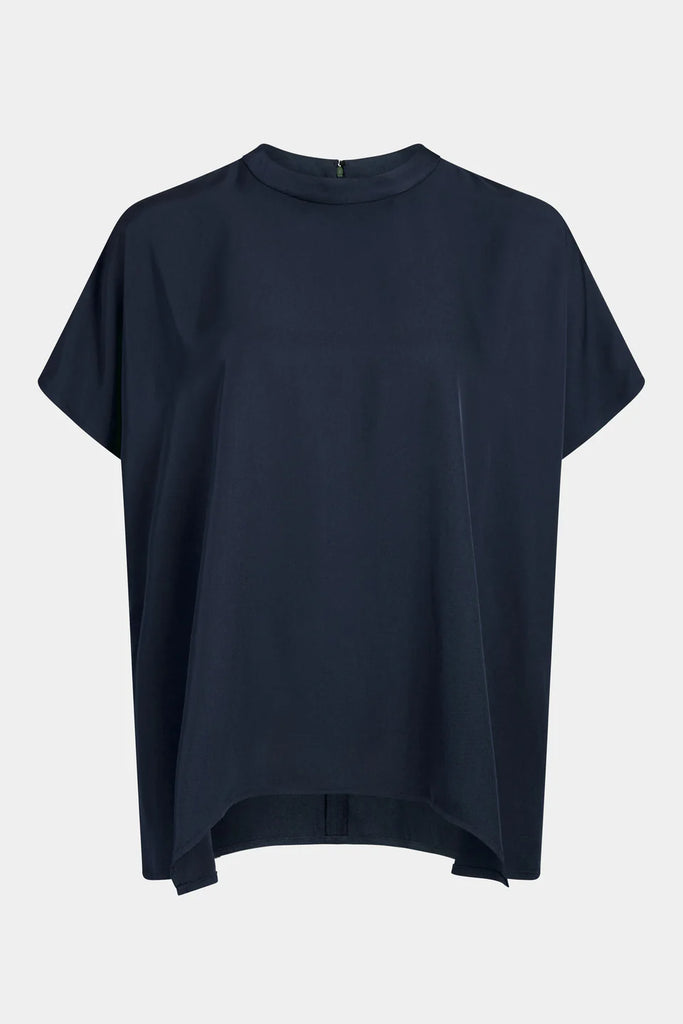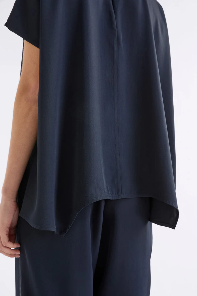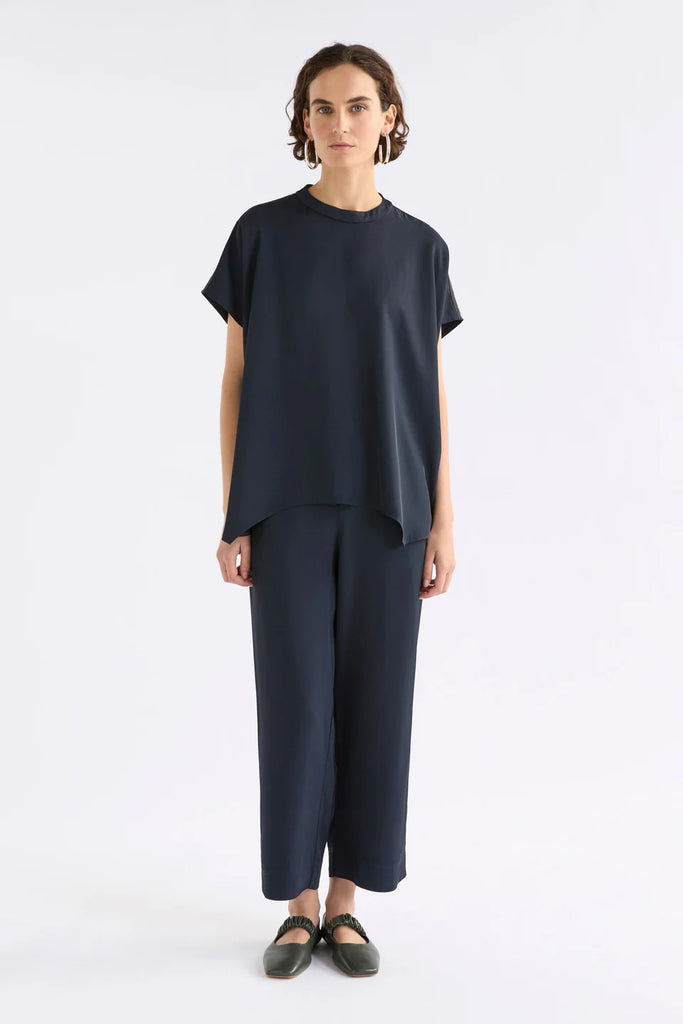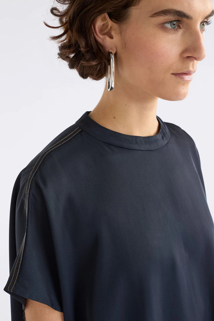 ELKThe Hullu Top encapsules relaxed sophistication with its easy, loose silhouette combined with its high, round neckline and contrast topstitch detailing that adds structure and definition to this modern shape. Crafted from a luxuriously, fluid NAIA™ acetate that offers a cool, structured, silk-like softness, subtle sheen and excellent drape and breathability. Featuring a subtle high-low, handkerchief hemline and short batwing sleeves, this piece looks great with the matching Hullu Pant or the Slinki Skirt for day-to-evening ensembles