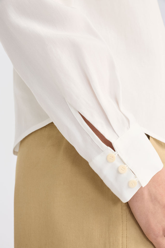 ElkThe Salli Shirt features classic collar with contrast top stitching creating a modern twist on shirt detailing. Made from GOTS certified organic cotton poplin with soft, smooth surface and gentle drape. A relaxed fit with slightly dropped shoulders and concealed button-through placket. Finished with patch pockets at chest and high-low hemline with curved side splits. Full-length sleeves with elongated buttoned cuffs complete this refined styling