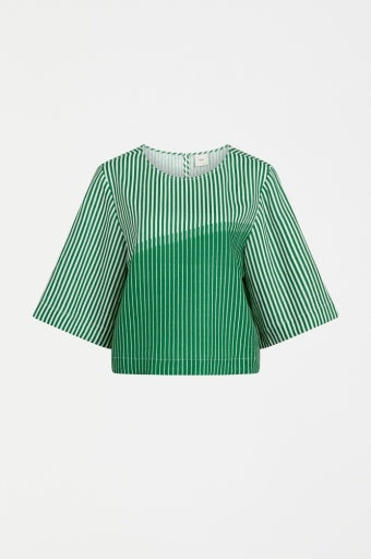 ElkThe Llinen Top is crafted from 100% French linen and features the striking Ortler Print in rich green with crisp white stripes. This breathable, natural fabric has a light, textured feel that softens beautifully with wear. Cut with a regular fit through the body and a subtle A-line shape at the hem, this cropped style features half-length set-in sleeves and a corozo button at the centre back keyhole closure. A fresh warm-weather top that pairs beautifully with high-waisted pants or skirts.