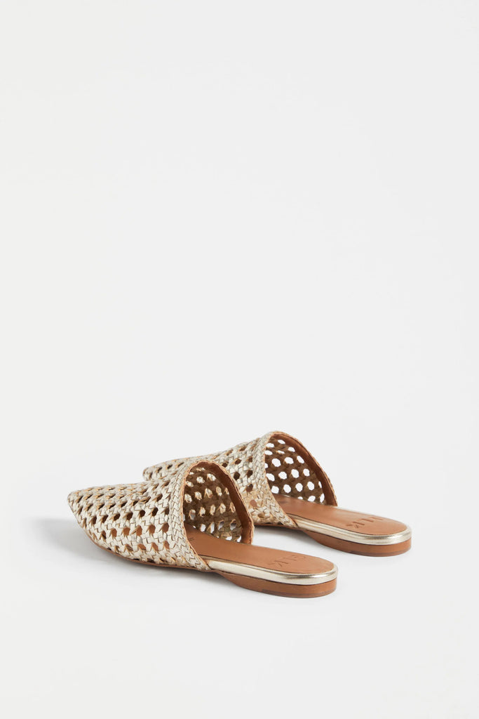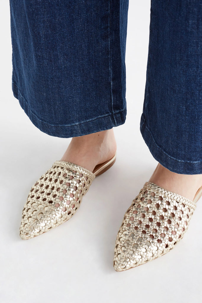 The Lyde Mule in Gold by Elk The Label is a flat mule with a pointed toe, crafted from an artisanal hand-woven goat leather.