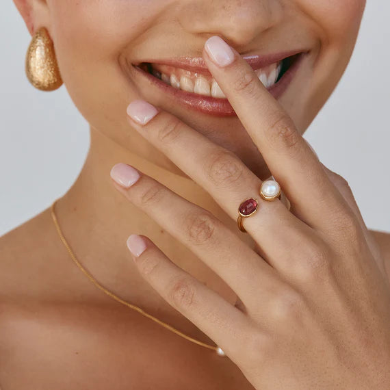 Radiating timeless elegance with a modern twist, the FAIRLEY Pearl & Pink Sapphire Ring is a captivating statement of refined luxury. At its heart sits a luminous freshwater pearl, symbolizing purity and femininity. Flanking the pearl is a pink sapphire—delicate yet vibrant—adding a touch of romantic charm and colour.