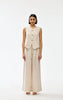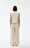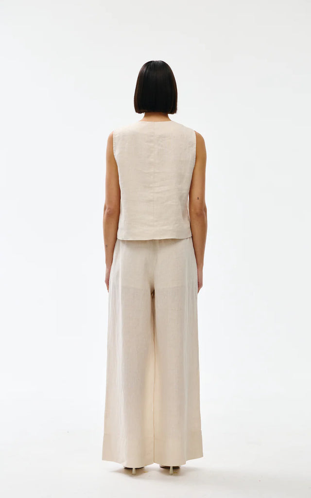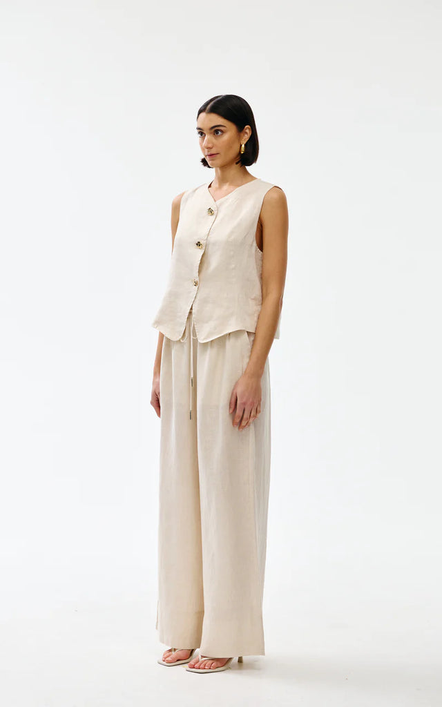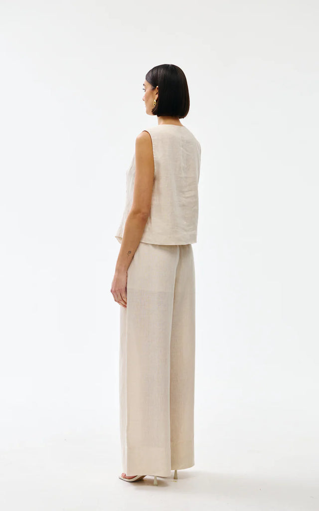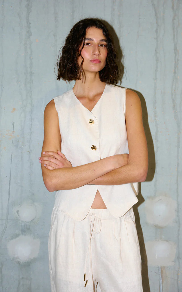 Crafted from soft, breathable linen, this sleeveless design features an elegant V-neckline and button front with distinctive gold-toned hardware.