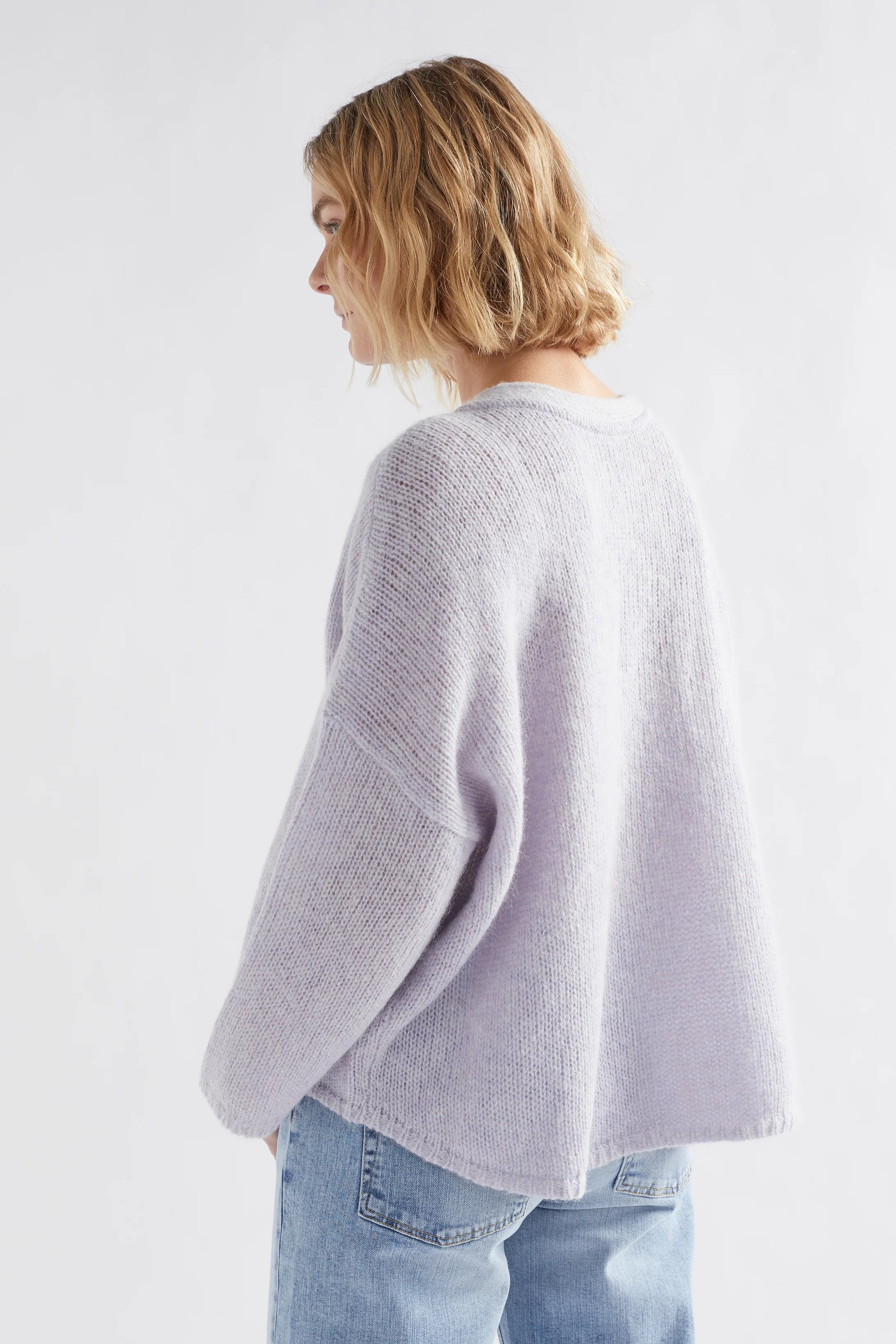 Our Agna Sweater is an Elk best-seller, appreciated for its slouchy fit year-round wearability. The design features a dropped shoulder and relaxed fit through the body, finished with a crew neck with additional scoop for a more lounge-style fit and wide sleeve opening to add to the laidback aesthetic. You can wear this sweater for nearly every occasion - whether you're adding a light layer over a printed dress, playing with proportions with a wide leg pant or striving for a cosy ensemble. The Plum and Jasper colours have a varying, melange effect and the lilac is pure, gentle colour.