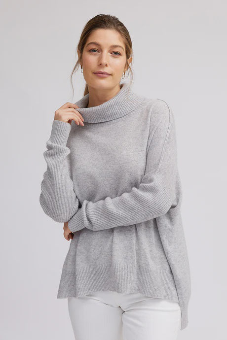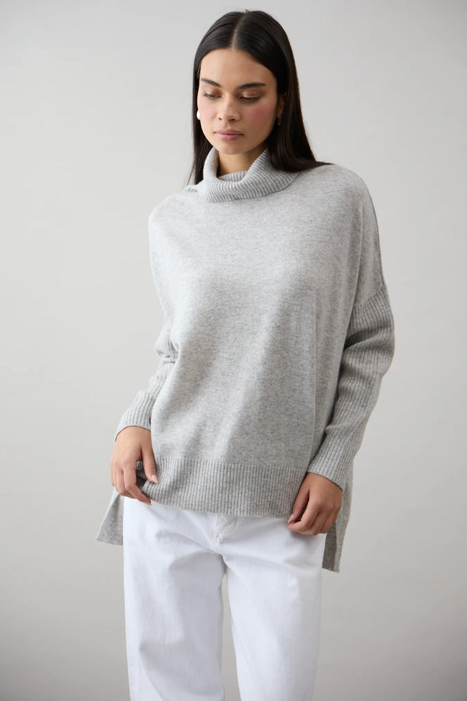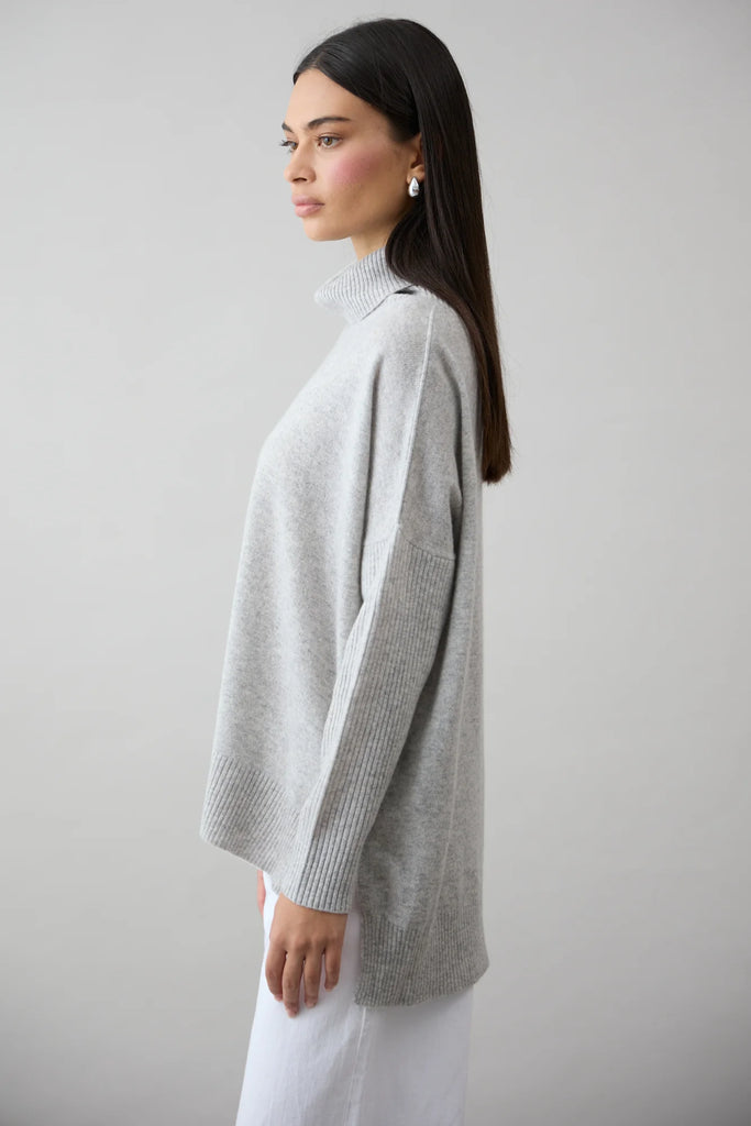 This timeless roll-neck knit is made from 100% Mongolian Cashmere. Featuring a flattering rib detail across the hemline and sleeves. The stepped back and side splits creates a relaxed drape to maximise comfort. This classic style looks great over jeans and is a winter wardrobe staple.