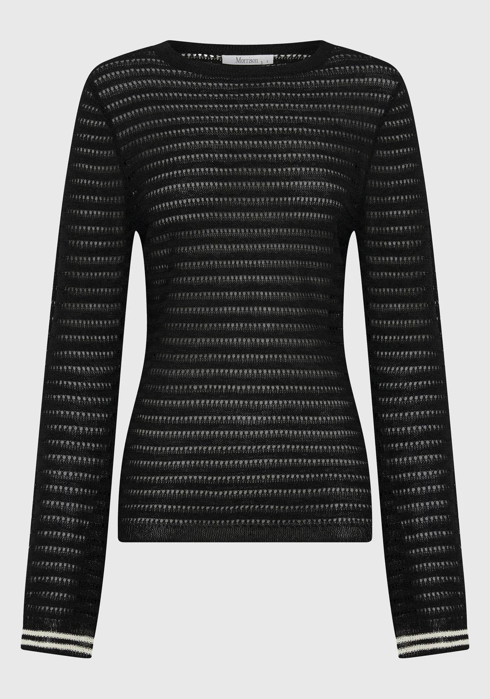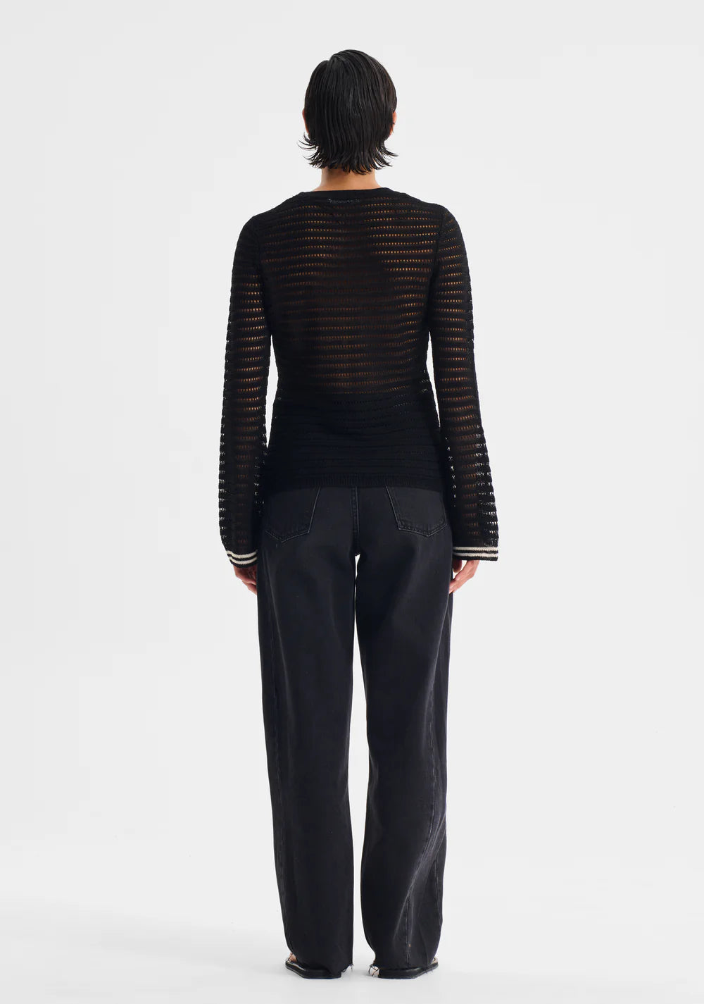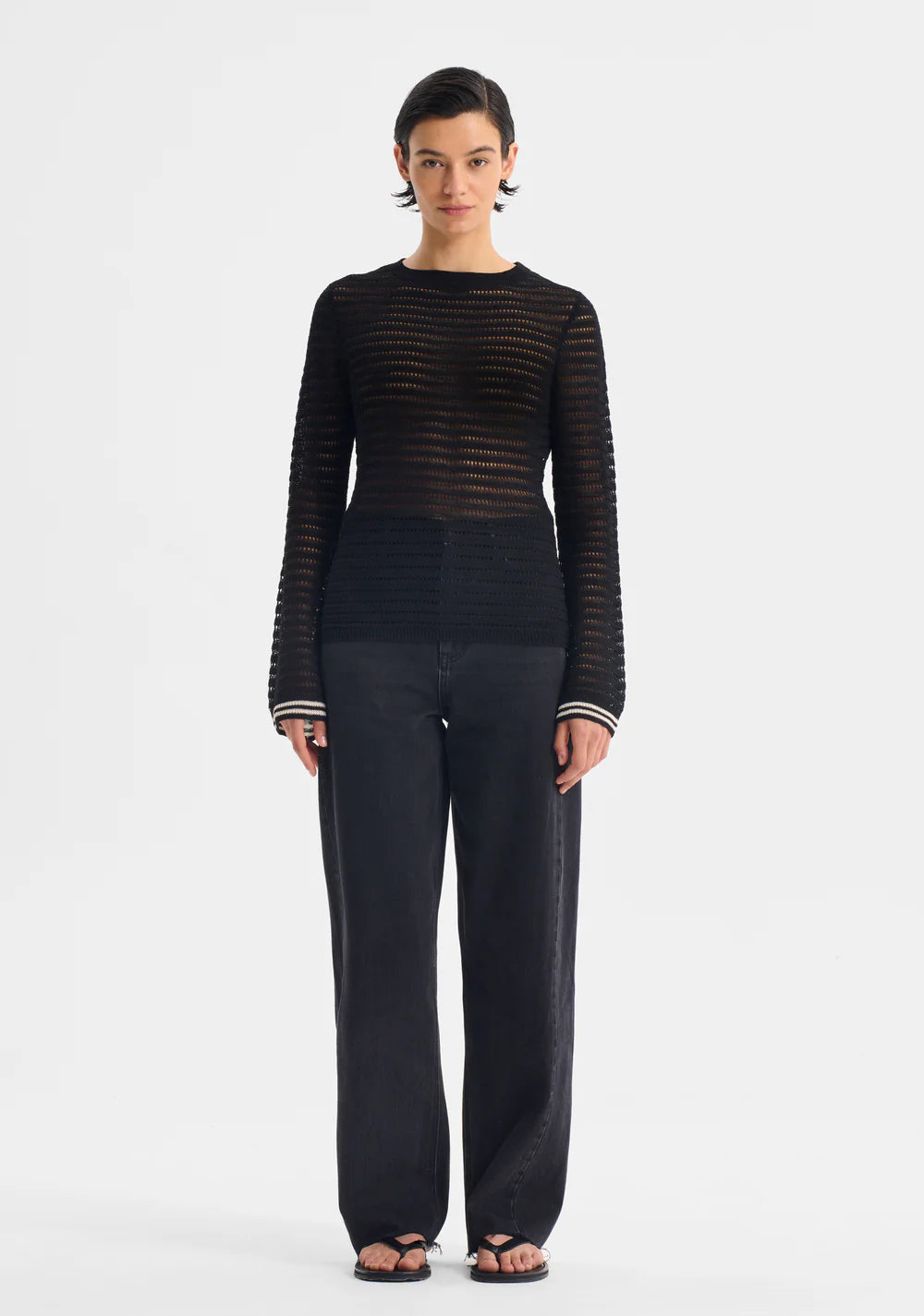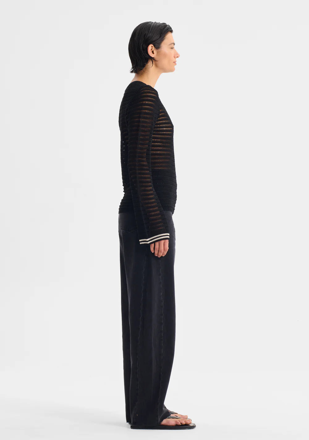 The Dallas Knit Pullover is crafted from a breathable cotton-blend yarn, it features a refined boat neckline, open mesh stitch throughout, and subtly flared full-length sleeves. A neat, close fit through the body is balanced by contrast stripe rib cuffs for a bold yet minimal finish.