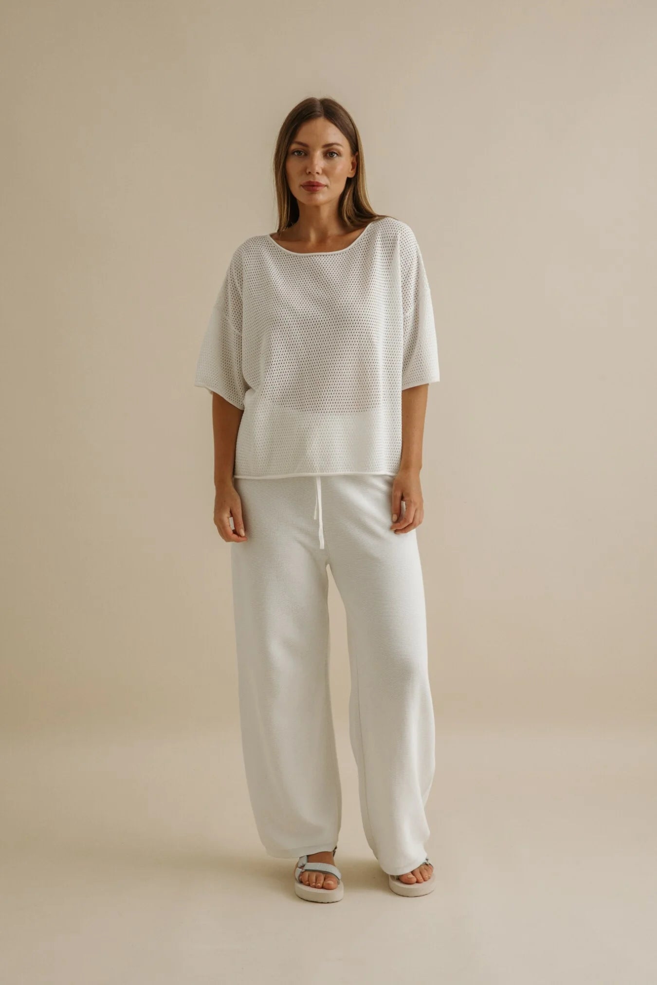 Light and airy with a quiet sophistication, The Nautilus high-twist cotton pullover is designed for effortless elegance. Its pointelle knit creates a delicate pattern of subtle perforations, offering breathability and texture while maintaining a soft, structured drape. The intricate openwork adds depth and visual interest, making it equally suited for layering or wearing on its own. Refined yet relaxed, this pullover transitions seamlessly from casual moments to more polished occasions—a timeless piece that feels as effortless as it looks.