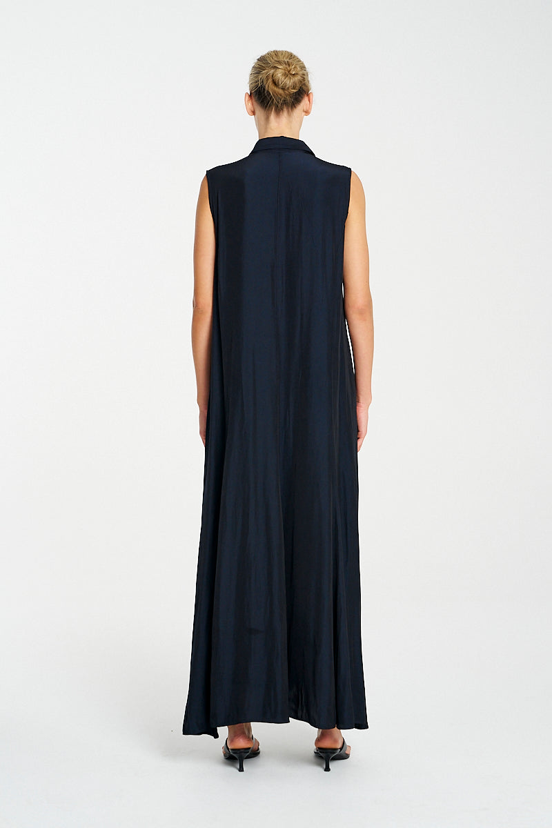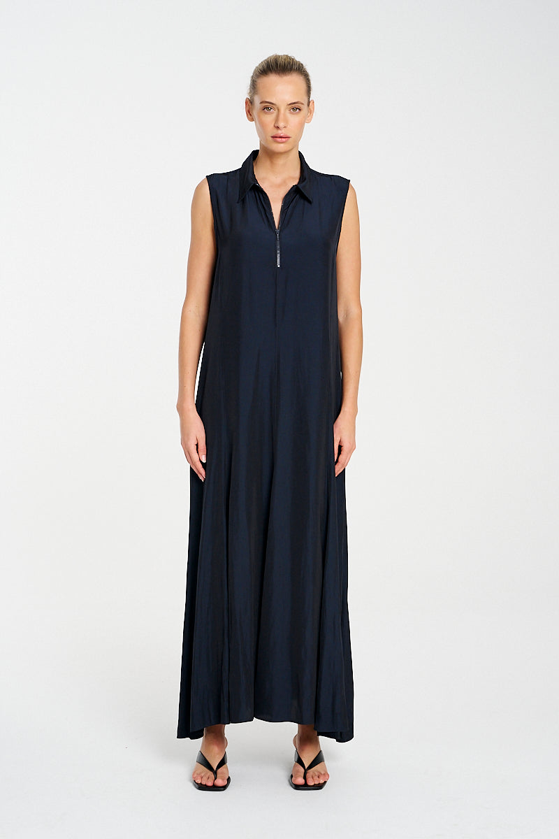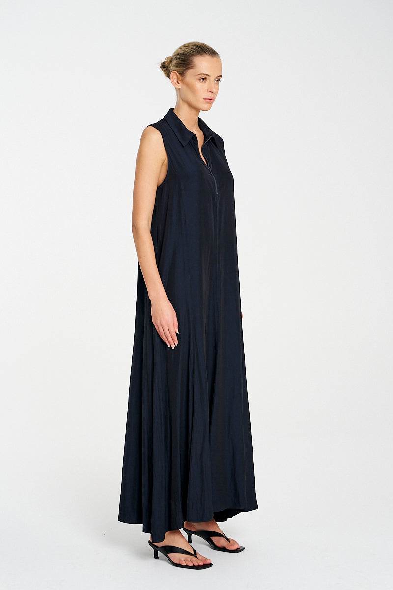 Crafted from Mela Purdie's classic Mache, a fine Denier technical weave with an airflow finish. The Flip Maxi Dress is the perfect dress for elevated casual dressing, featuring a zip front closure, clean collar and full skirt with panel details.