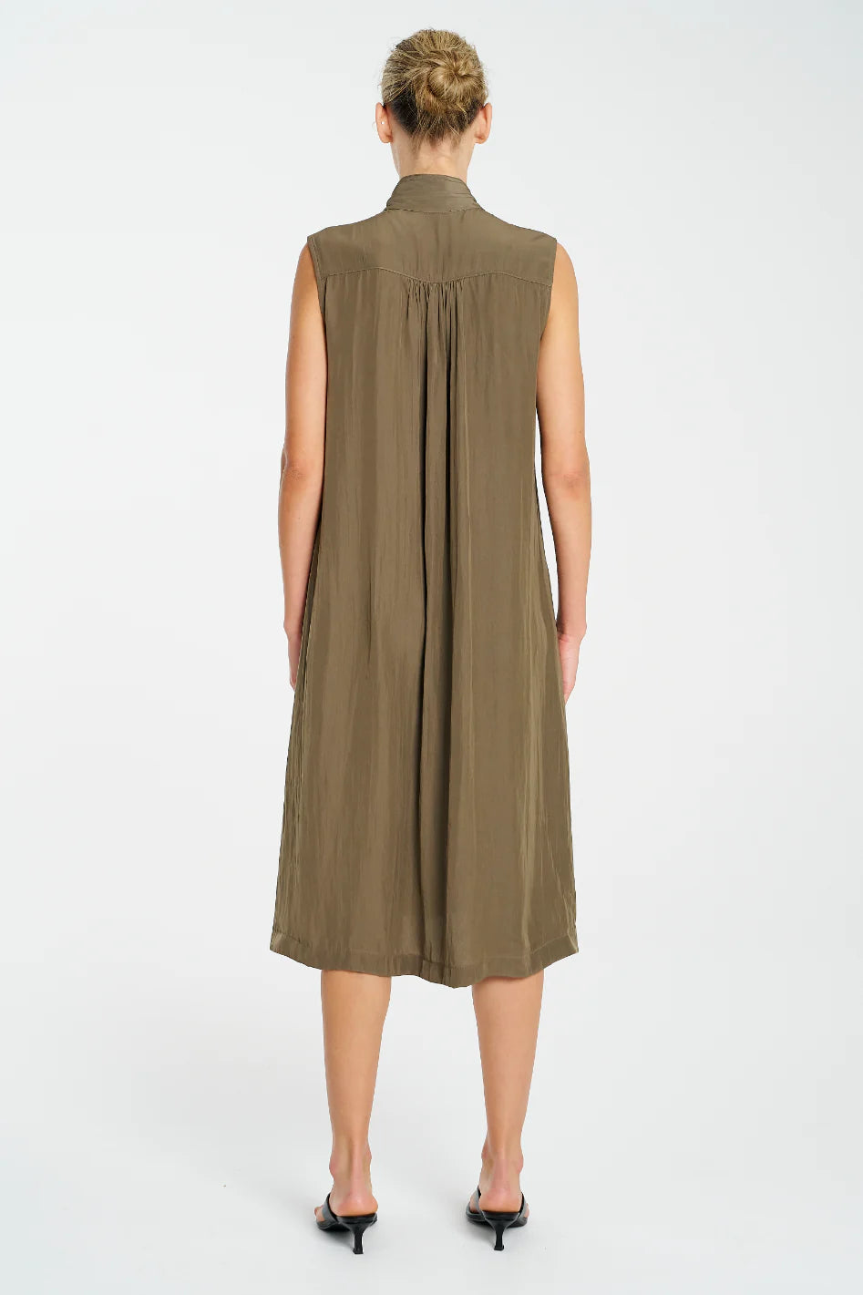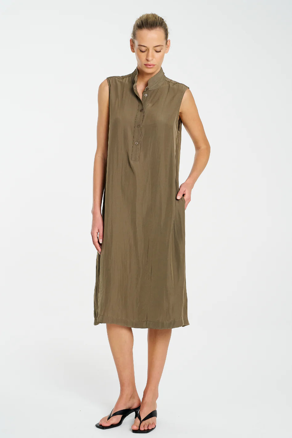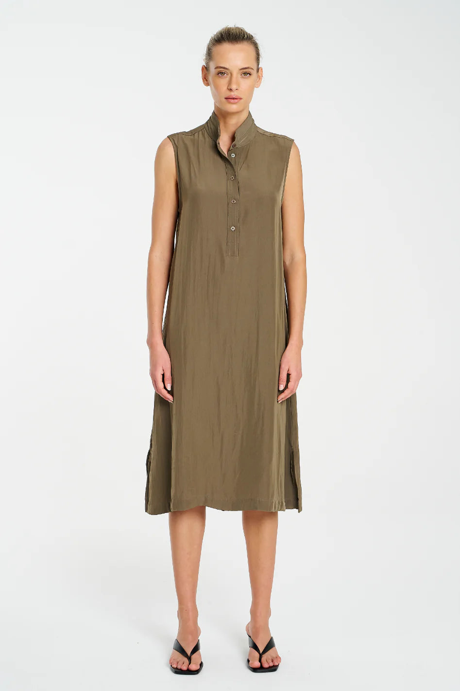 Crafted from Mela Purdie's Mache, featuring a relaxed fluidity & smooth lustre surface. The Tab Slide Dress features a crisp collar stand with tab button closure.