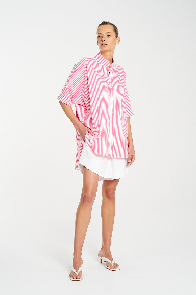 Crafted from Mela Purdie's Lightweight Striped Microprene, a crisp, cotton rich fabric with high stretch and a polished finish, featuring a bold yarn dyed stripe. The Villa Overshirt offers a relaxed fit silhouette and stand collar, this is a wardrobe essential.