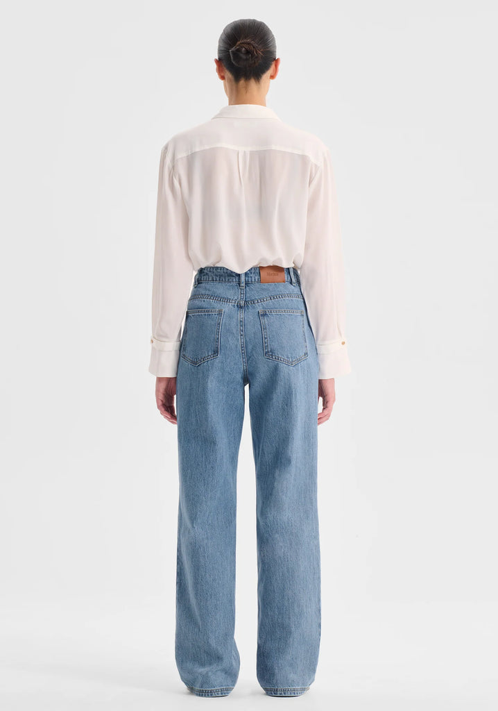 MorrisonCrafted from mid-weight cotton denim, the Jacque Jean sits high on the waist with a classic fly front. Jet pockets, back patch pockets, and pintuck detailing along the front leg add subtle structure, while the straight-leg, full-length cut offers timeless versatility.