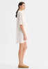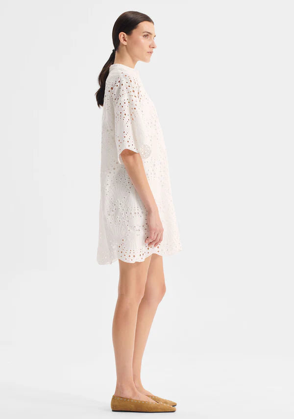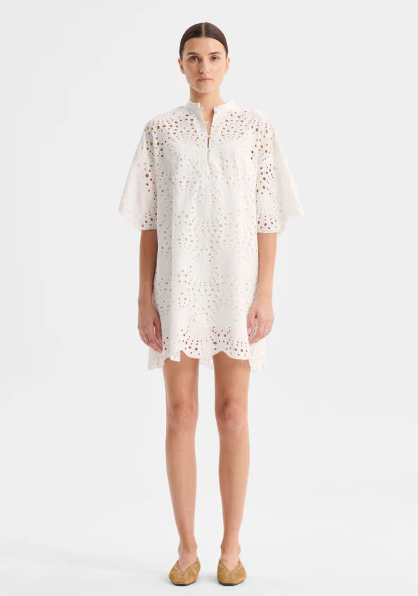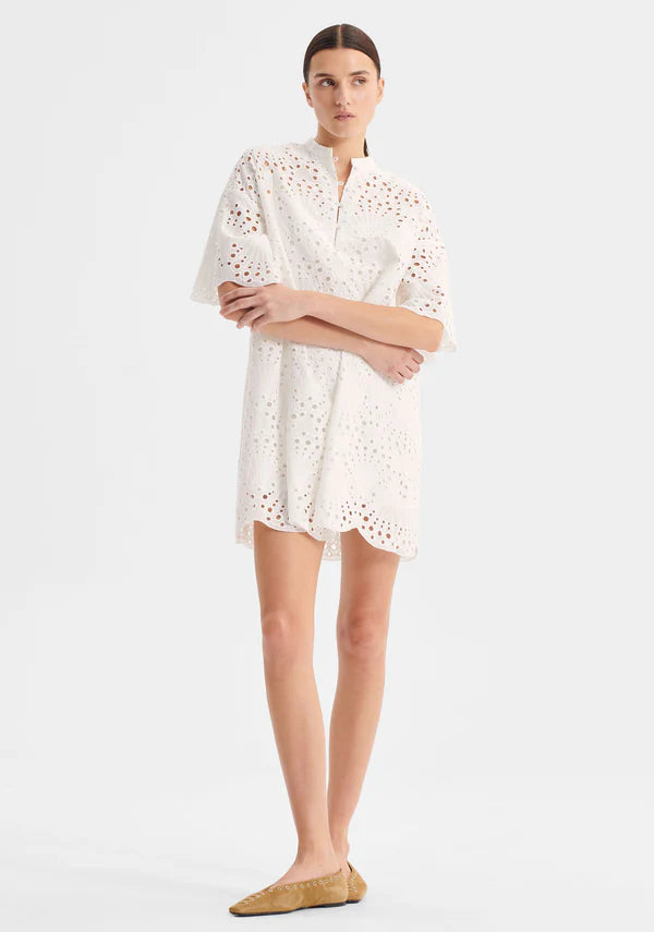 Crafted in delicate cotton broderie anglaise, the Saffron Dress features a clean stand collar, loop-button closure, and a relaxed slip-on shift fit. Scalloped sleeves and hem bring soft texture, while the above-knee cut keeps the silhouette fresh. Includes a separate slip for effortless layering.