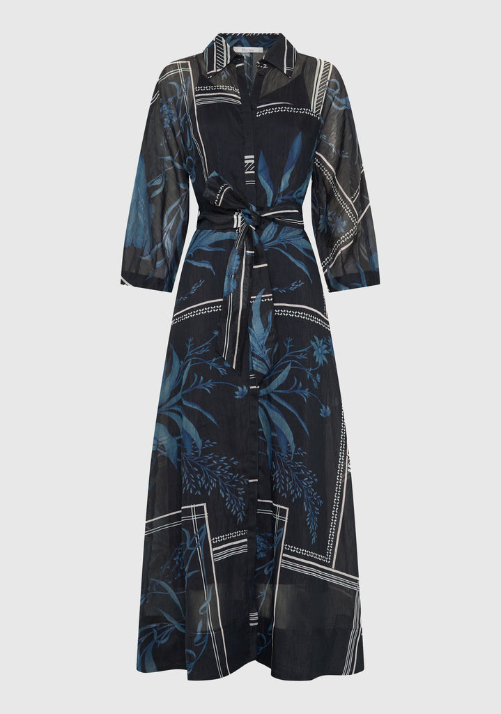 MorrisonThe Antigua Dress showcases Morrison’s exclusive print on a lightweight linen blend. Designed with a collared neckline, concealed button front, and ¾ dolman sleeves, it’s tailored with waist darts and flows into an A-line midi skirt. Finished with a separate slip for coverage.