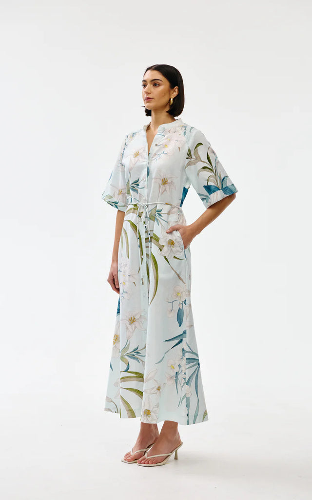 KinneyThe Gigi Dress in Portofino is an ode to breezy coastal elegance. Featuring a flowing silhouette with a soft botanical print, this shirt-style dress can be cinched at the waist with a detachable tie, offering adjustable shape and comfort.