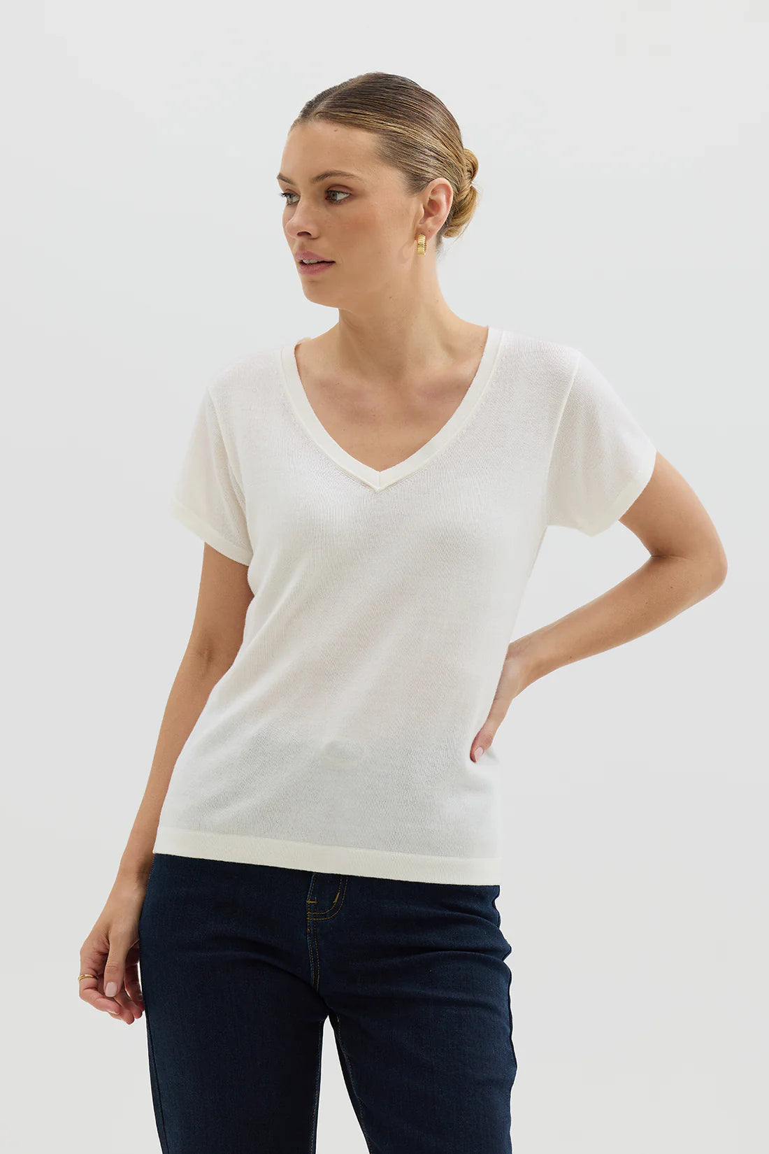 The ultimate everyday essential, redefined in pure Merino. Our Merino Wool T-Shirt is a luxurious take on a wardrobe classic. Crafted from 100% Australian Merino wool, this lightweight knit tee offers natural breathability, softness and temperature regulation—perfect for layering or wearing on its own. Featuring a clean V-neckline, short sleeves and a relaxed-yet-flattering fit, this ivory tee blends timeless simplicity with functional elegance. Whether tucked into tailored trousers or worn loose with denim, it’s a go-to foundation piece you'll reach for all year round.