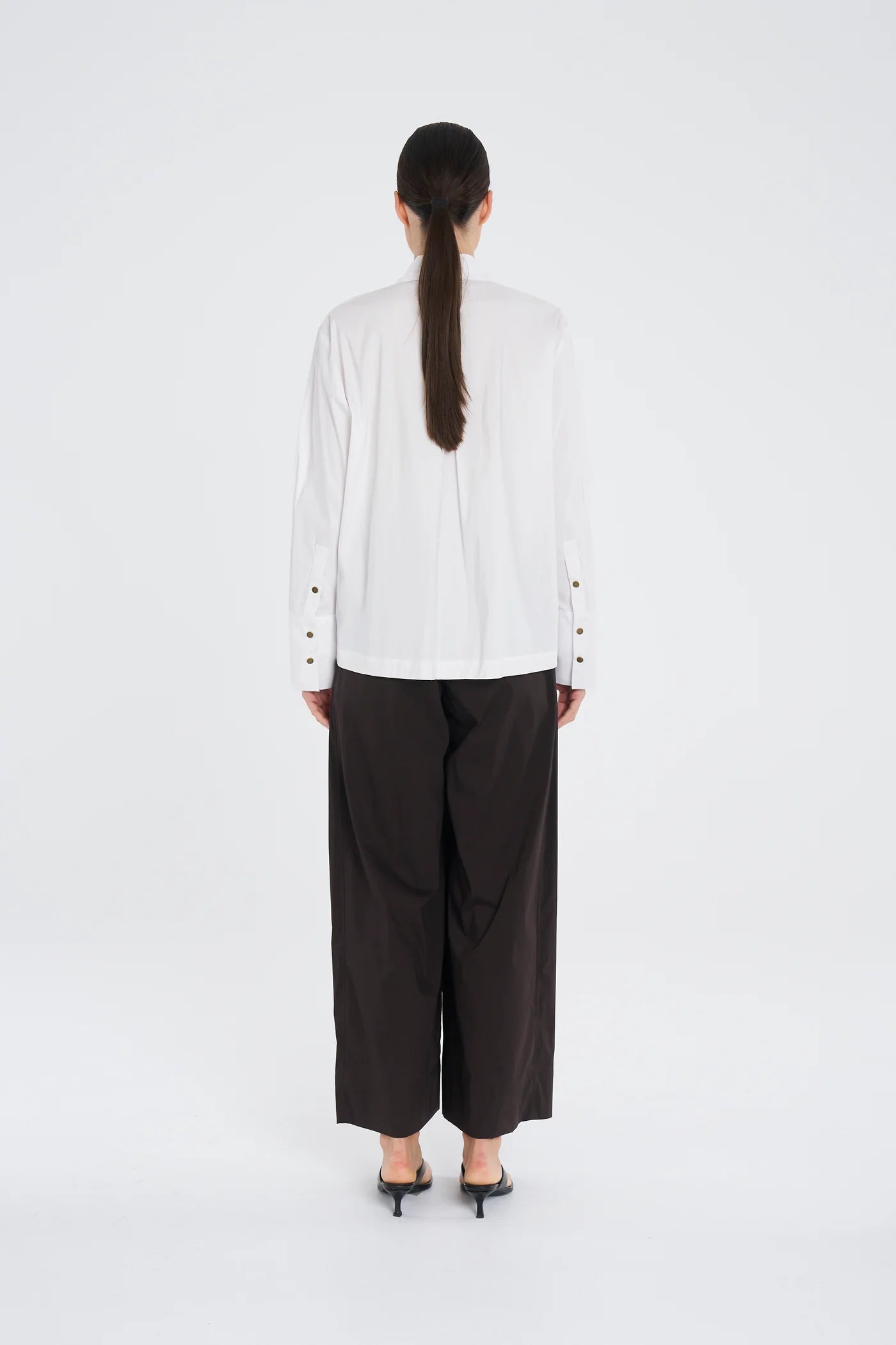 Crafted in Mela Purdie's Lightweight Microprene, A crisp, cotton rich fabric with high stretch and a polished finish. The Stud Shirt features a stud button closure, deep shirt cuffs and a straight hem, making it an elevated take on a classic shirt silhouette.