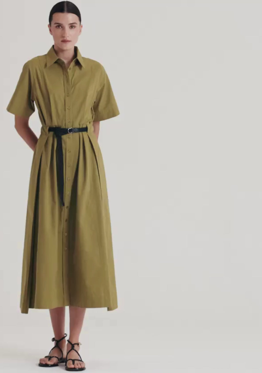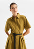 Crafted in cotton twill, the Ingrid Shirt Dress combines structure with ease. A traditional collar, button front, and tailored bodice create polish, while short sleeves and tunnel waist detailing add interest. Finished with an A-line midi skirt and contrast belt, it’s a versatile piece for everyday or occasion wear.