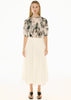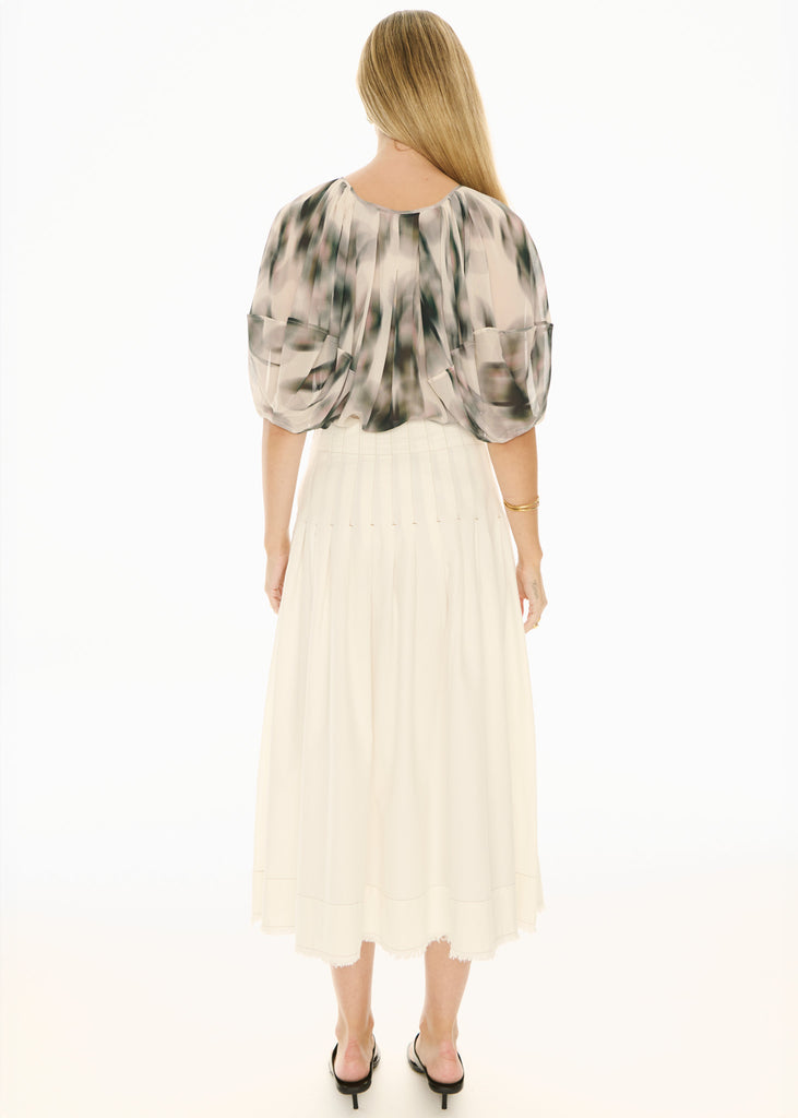 -Stitched down knife pleat detail over the hips, flaring out into a full silhouette.