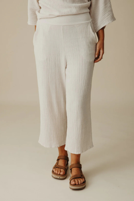 The new Sunshine Beach Flow Pant in Pumice/White by Talamaya, has a flat front waistband with pockets along with a soft elastic shirred waistband – to pull on with ease.