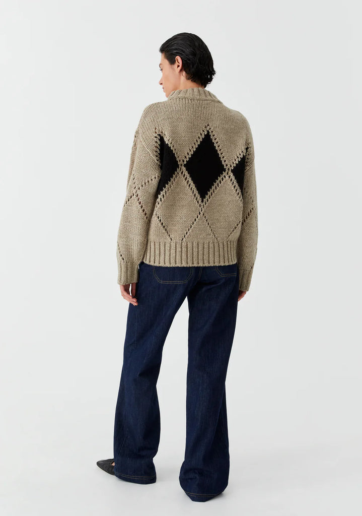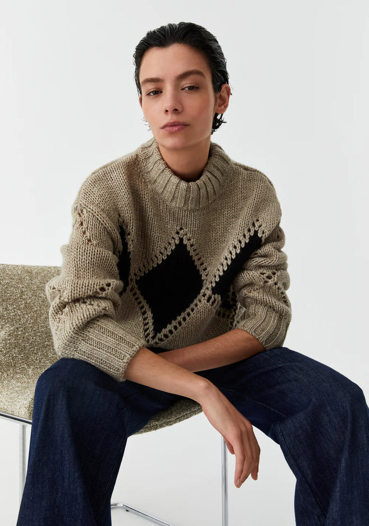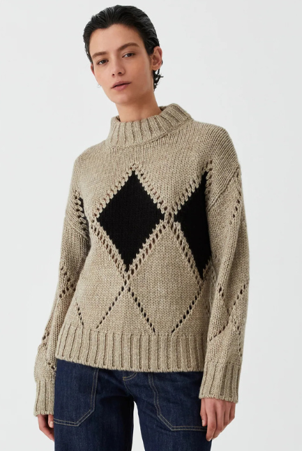 MorrisonThe Eden Knit Pullover in Pebble by Morrison is crafted from a chunky wool blend with recycled fibres, delivering a cozy feel. Featuring delicate diamond pointelle detailing, it’s finished with a high neckline, dropped shoulders, and full-length sleeves with fitted cuffs. A relaxed fit through the body ensures both comfort and style for cooler days.