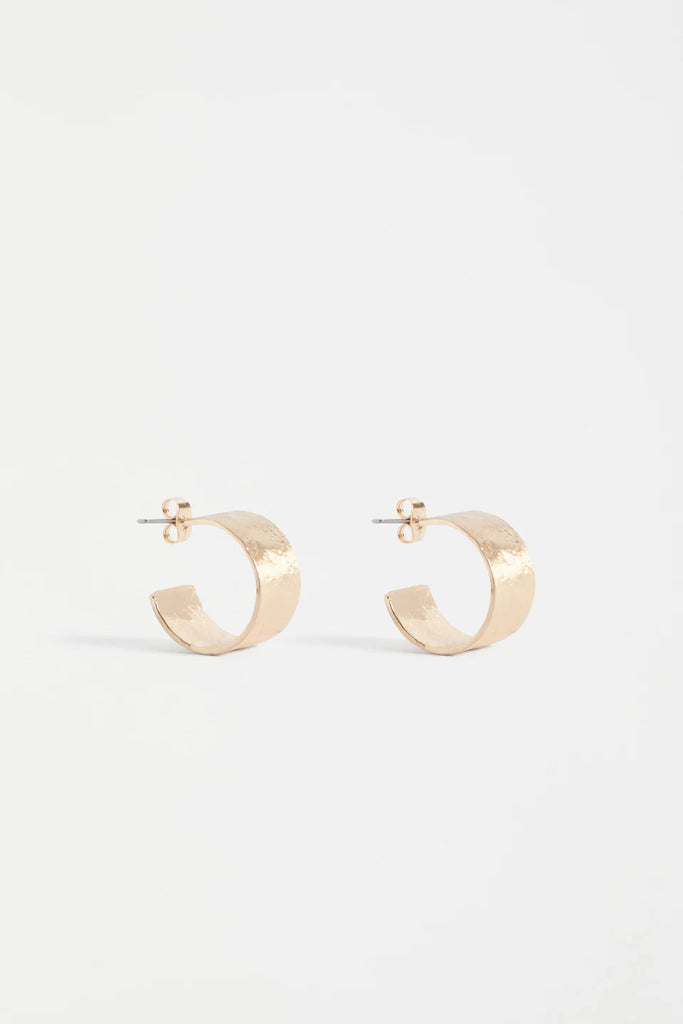 The Gild Hoop Earring is a classic style featuring a hammered texture and a brushed metal finish. This style can be paired with the Gild Cuff Bangle for a versatile look.