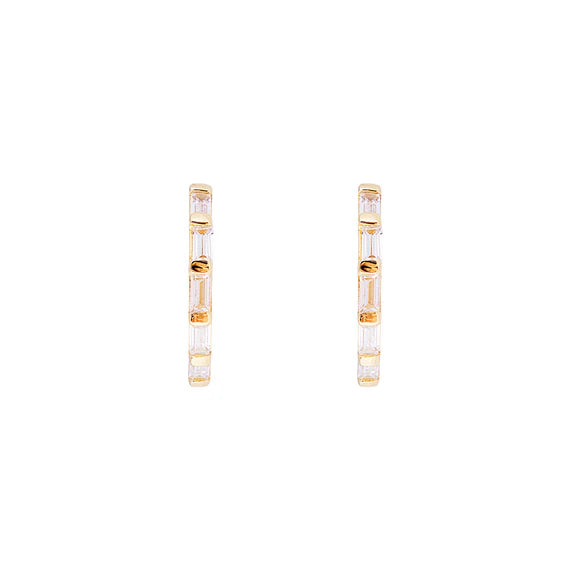 These simply stunning finer mid size hoops comprise sparkling CZ baguette stones set in recycled sterling silver 18k gold plate. An elegant everyday extremely light weight hoop that goes with everything.