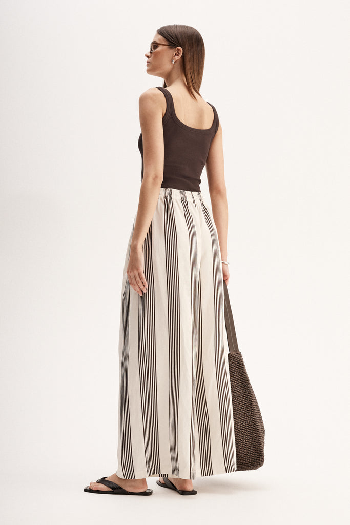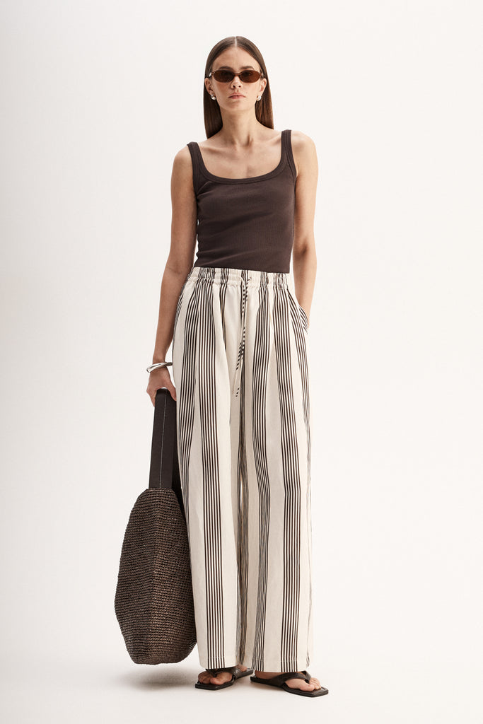 Elka CollectiveMade of a lightweight fabric with a statement stripe, the Milo Pant is an effortless summer piece. Cut to a wide leg silhouette, these pants have an adjustable drawstring waist. Style with comfortable basics for an elevated casual look.