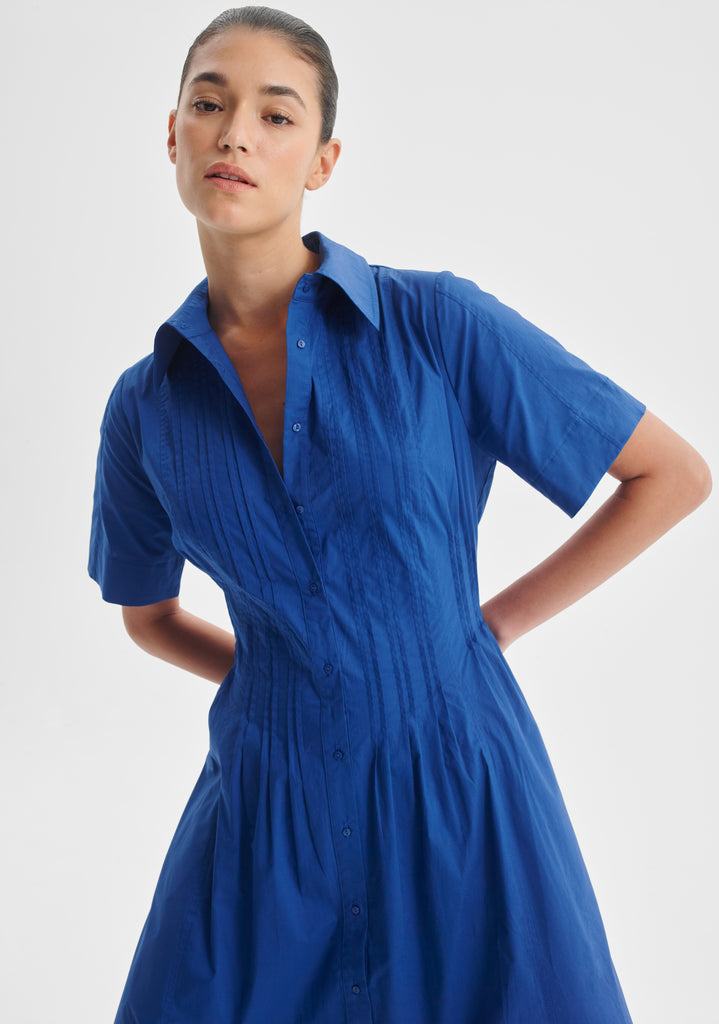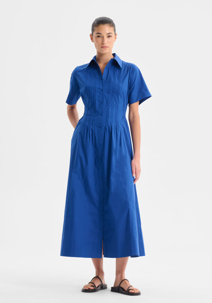 MorrisonCrafted from mid-weight cotton poplin, the Arabella Dress features a traditional collar, button front placket, and short sleeves with wide cuffs. Thoughtful pintucking at the waist creates a flattering shaped silhouette, complemented by side seam pockets and a flared midi-length skirt.