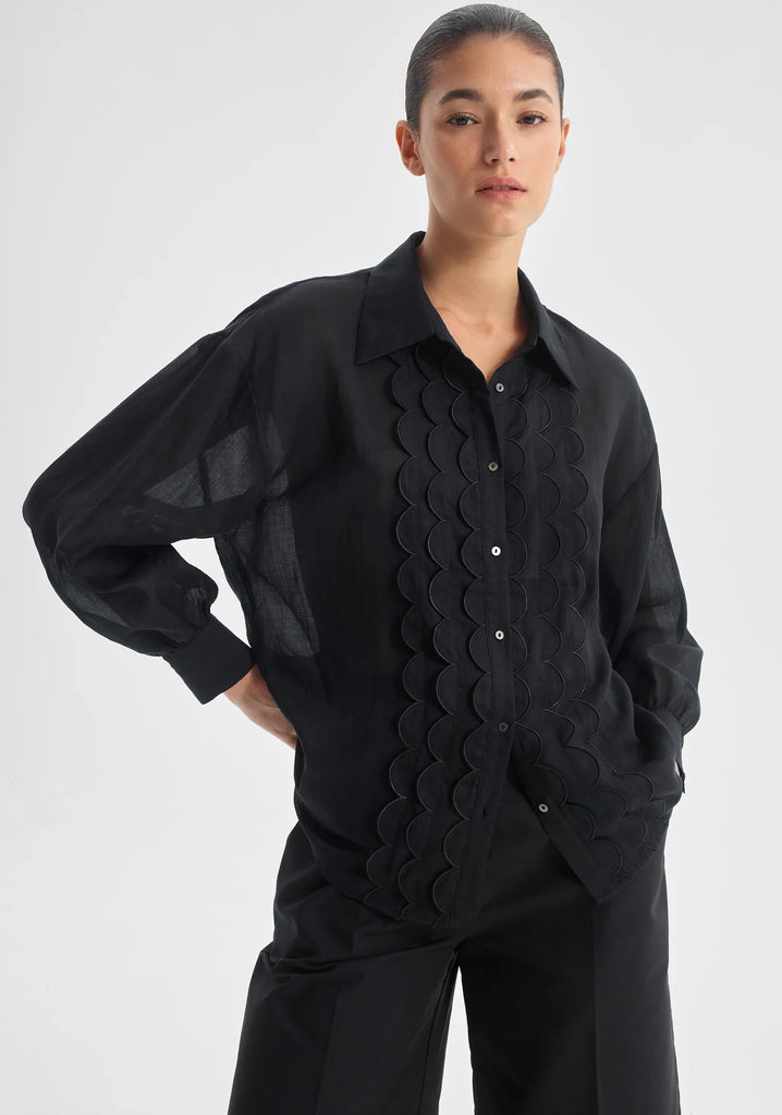 MorrisonThe Constance Shirt, cut in a ramie blend, offers effortless elegance with its elongated collar, relaxed dropped shoulders, and flowing billow sleeves. Finished with buttoned cuffs and scallop detailing through the front for subtle texture.