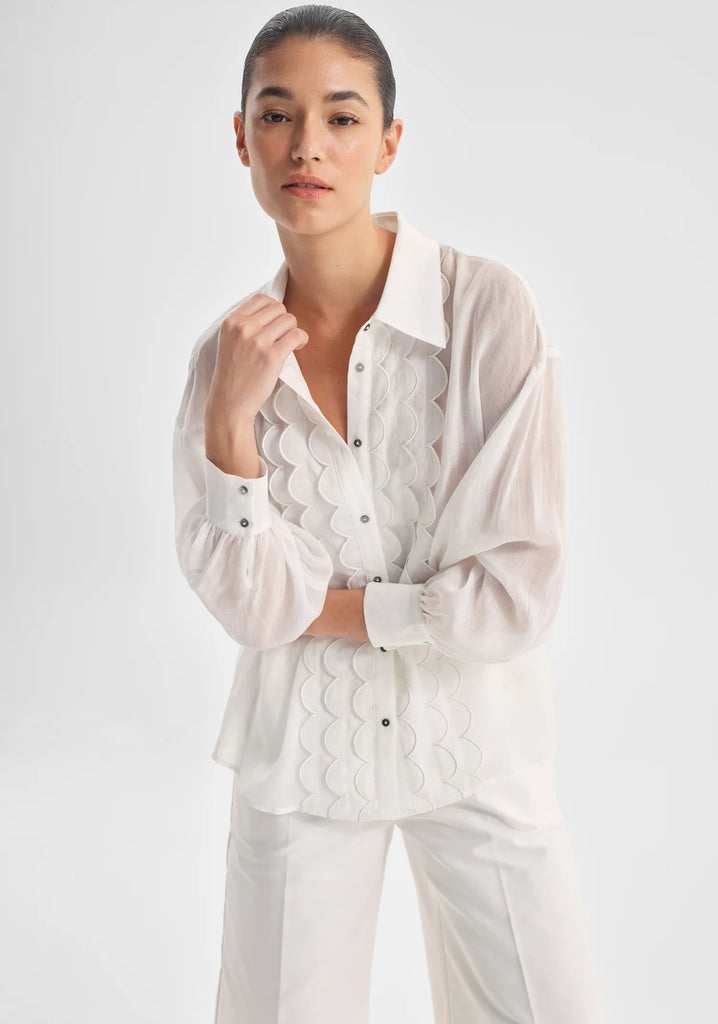 MorrisonThe Constance Shirt, cut in a ramie blend, offers effortless elegance with its elongated collar, relaxed dropped shoulders, and flowing billow sleeves. Finished with buttoned cuffs and scallop detailing through the front for subtle texture.