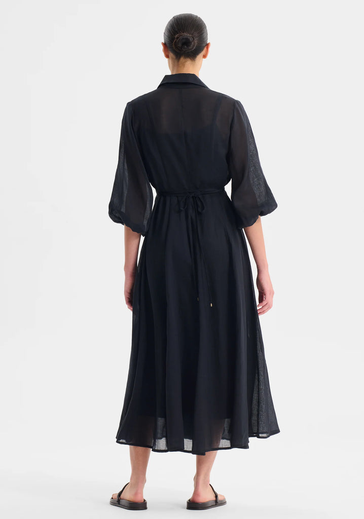 MorrisonThe Constance Shirt Dress is designed in a lightweight ramie blend with a flowing midi silhouette. An elongated collar and button-through front meet soft billow sleeves and elastic cuffs, finished with scallop detailing and a waist tie for definition.