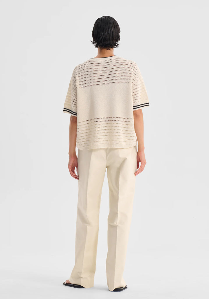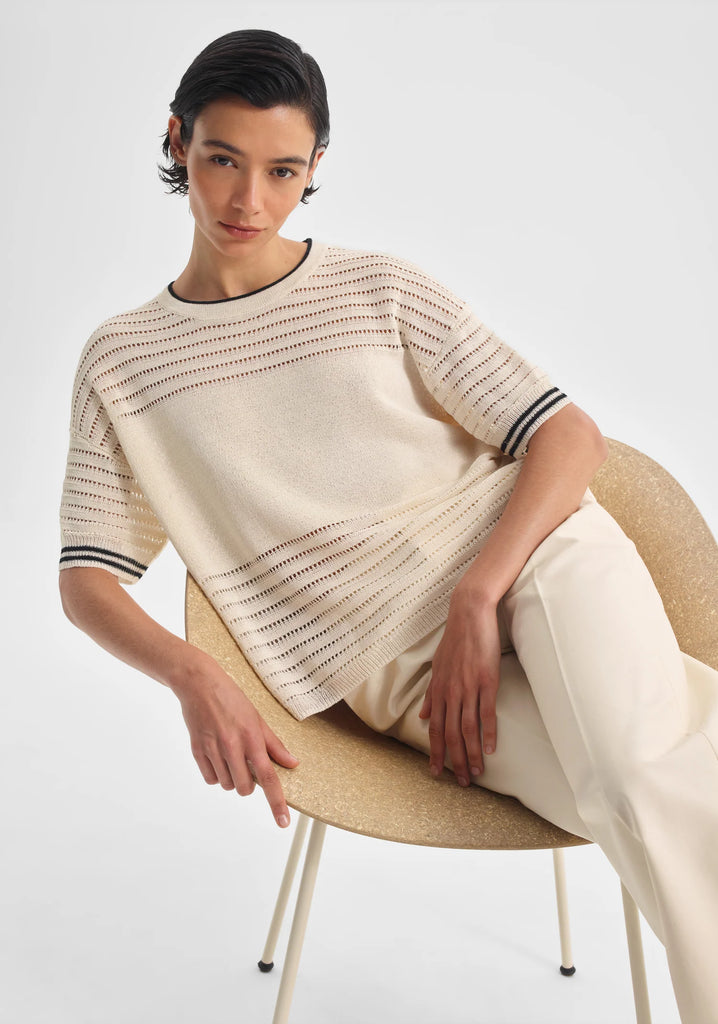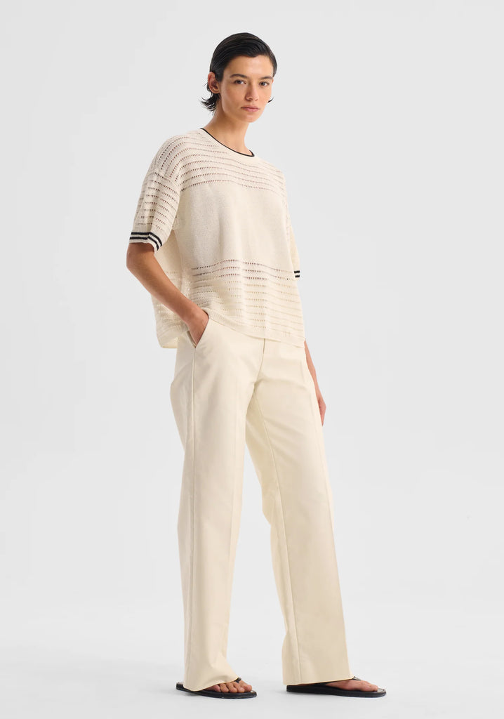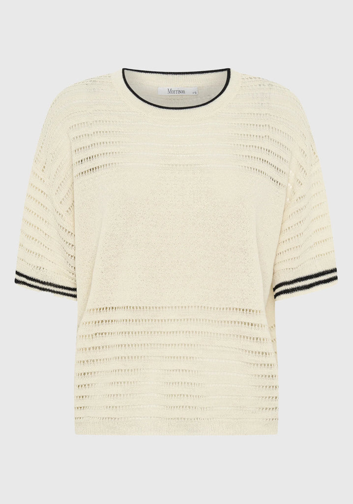 MorrisonThe Dallas Knit Tee is crafted from a luxe cotton-blend yarn, it features an open mesh stitch throughout, elbow-length sleeves, and refined jersey stitch paneling at the chest. Contrast stripe detailing at the neck and sleeves adds a modern touch, while ribbed trims and a relaxed, boxy silhouette ensure an understated yet polished finish.