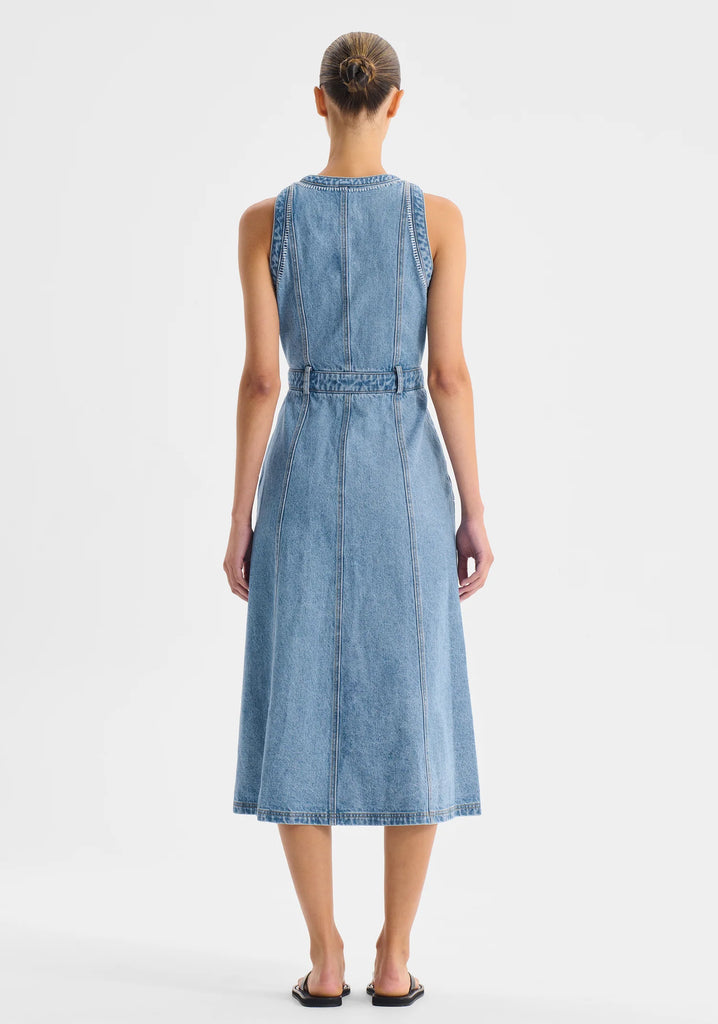 MorrisonCrafted from mid-weight cotton denim, the Hendrix Dress features a V-neckline, sleeveless bodice, and button-front design. Embroidery detailing adds texture, while a fitted waist and A-line midi skirt with slant pockets create a flattering silhouette.