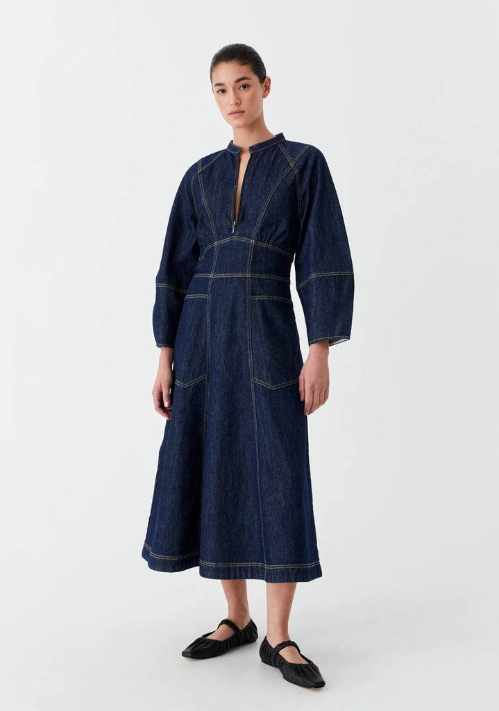 MorrisonCrafted from mid-weight cotton denim, the Tyler Denim Dress features a stand collar with a zip front neckline. It’s designed with raglan 3/4 sleeves, a fitted empire-line bodice, and an invisible zip at the side. Front patch pockets and panel detailing enhance the design, while an A-line skirt completes the midi-length silhouette.