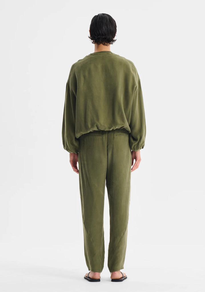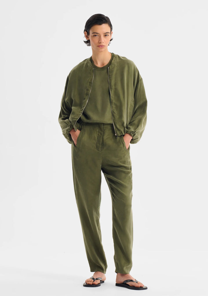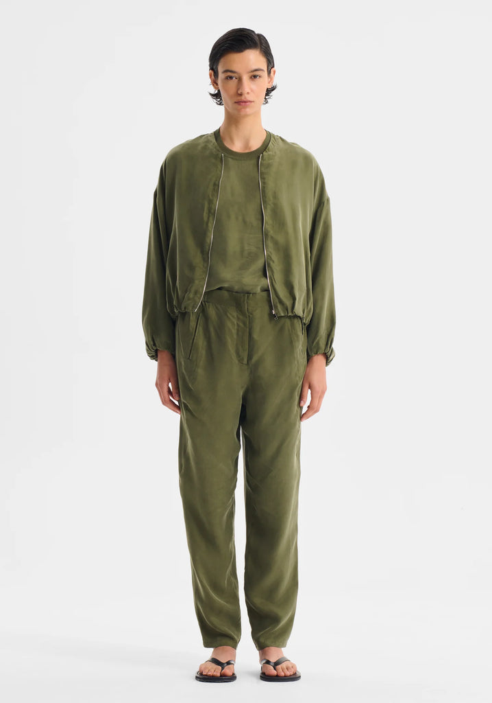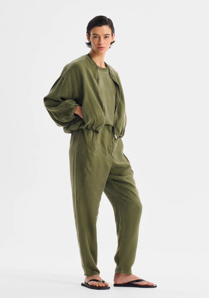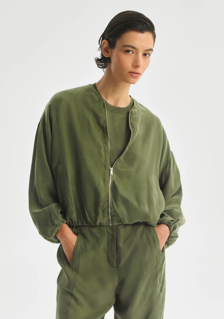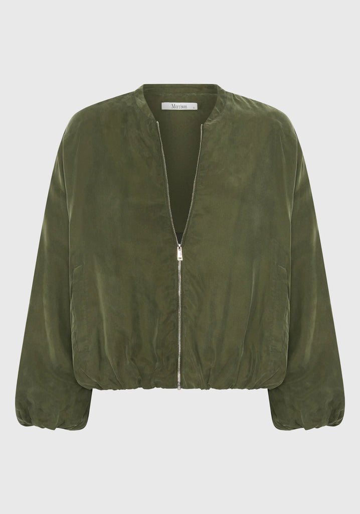 MorrisonCrafted from a smooth cupro blend, the Zeke Jacket features a round neckline, dropped shoulders, and a relaxed fit. A zip-front closure, front welt pockets, and concealed elastic at the cuffs and hem create a clean, contemporary finish. Fully lined for comfort and ease.