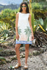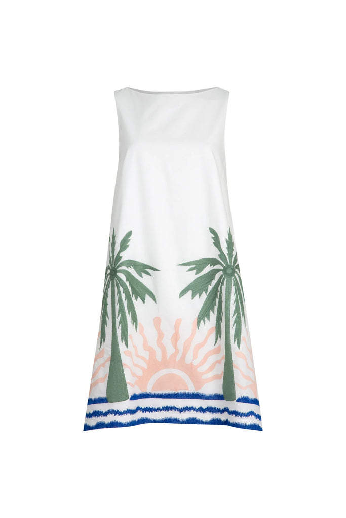Defined by its clean lines and effortless silhouette, the ‘Tropical Shift’ dress brings modern polish to warm-weather dressing. Crafted in crisp ‘Sunset Boulevard’ cotton, its boat neckline and simple shift shape are elevated by tropical-inspired embroidery, creating a fresh yet timeless look.